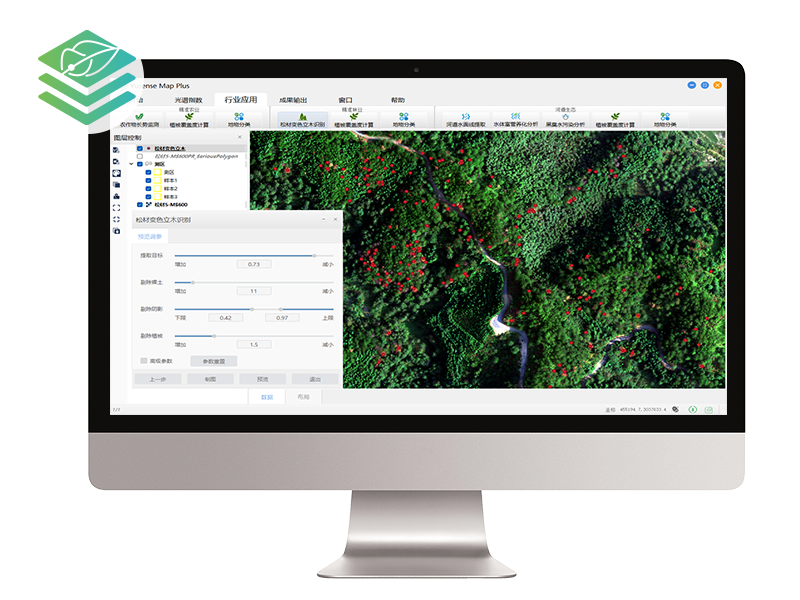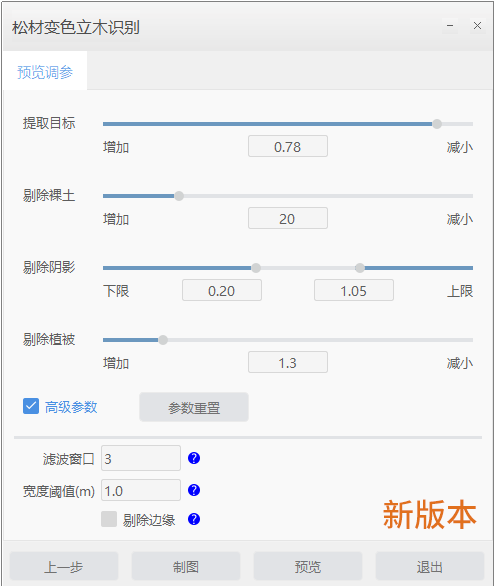 V1.4.0版本将林业模块下的松材变色立木识别模块的功能全新升级,包括算法架构和算法调参项功能,显著提升了变色立木提取准确率及适用场景,同时将调参选项减少,并增加了参数项的功能描述,提升用户自定义提取的应用体验。