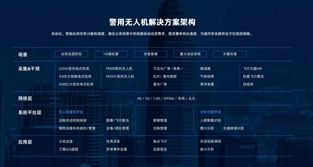 为响应公安部和省公安厅对警用无人机发展规划的要求,提升警用无人机在实战中的应用水平,支撑快速响应能力,日前,江苏某公安按照全域统建、全量纳管、全局共享、分级调度原则,开展警用无人机实战应用一体化平台建设,在全市不同的应用场景部署数十套套复亚智能无人机机场,实现警用无人机全覆盖,大幅提升全市重点区域空域感知能力、全局无人机协同作战能力。 规模化部署,覆盖全市重点区域 与此同时,应对辖区大、平均警力少、警用无人机的建设规模仍然没能达到实战需要的问题,当地公安乘着低空经济的东风,不断迭代升级,结合不同场景需求与实地情况,在全市重点关注区域、文旅商贸区域、治安重点区域、城市快速路及重要枢纽、水域卡口等位置部署数十套复亚智能无人机A30E机场,通过科学选点布局实现治安和交通事件的自动巡检、快速发现、快速响应。 快速响应,打造5分钟出勤圈 应用于不同的实战场景,复亚智能A30E无人机机场内置的高精度机械臂,可快速自动换电,支持高频次作业。 数十套复亚智能机场部署在当地重点区域,无需人员值守,对无人机航程覆盖范围内的区域进行7x24小时自动巡逻、巡检,随时待命侦察干预突发情况,5分钟快速响应抵达现场,满足重大活动安保、敏感案事件的及时响应、高效保障。 通过在不同场景需求多点位部署适宜的无人机机场,结合警用无人机实战应用一体化平台,联动地面实战部门和一线勤务部门,江苏某公安全提升全市重点区域空域感知能力、全局无人机协同作战能力,交通拥堵事故及时发现能力、水域卡口码头巡检查缉能力、水域应急救援能力、重大安保活动人流车辆高效管控能力,实现“情指行”一体化协调作战,提升社会治安掌控力,为当地建设增添智慧底色,推进新质公安战斗力加快形成与提升。 “软硬”实力同步发展,近日,复亚智能还全新发布了V6版本无人机飞行管理平台,基于业务需求的飞行,真正发挥低空数据价值,解决城市管理中的实际问题。新平台系列介绍持续更新中,欢迎关注。