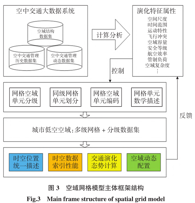 构建城市低空空域网格模型,其核心是分析空中交通管理结构、交通流量结构、空域配置结构及空中交通运行数据集等时间属性特征和空间属性特征,包括空中交通的空间尺度、时间范围、运动特性及飞行冲突、空域容量、安全等级、航空效率、管制负荷、空域复杂度等,根据此情况开展空中交通管理的空域网格单元划分,确定网格单元的空间和时间精度,分析网格单元对应的索引性能、空中交通演化态势计算等,从而实现把连续空中交通空域离散成为多级网格单元系统,形成统一的时空描述方法,即空中交通管理的四维时空框架。