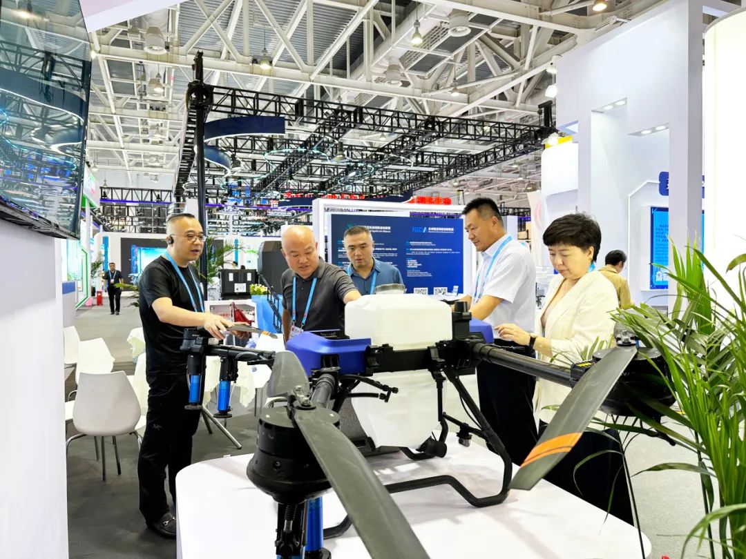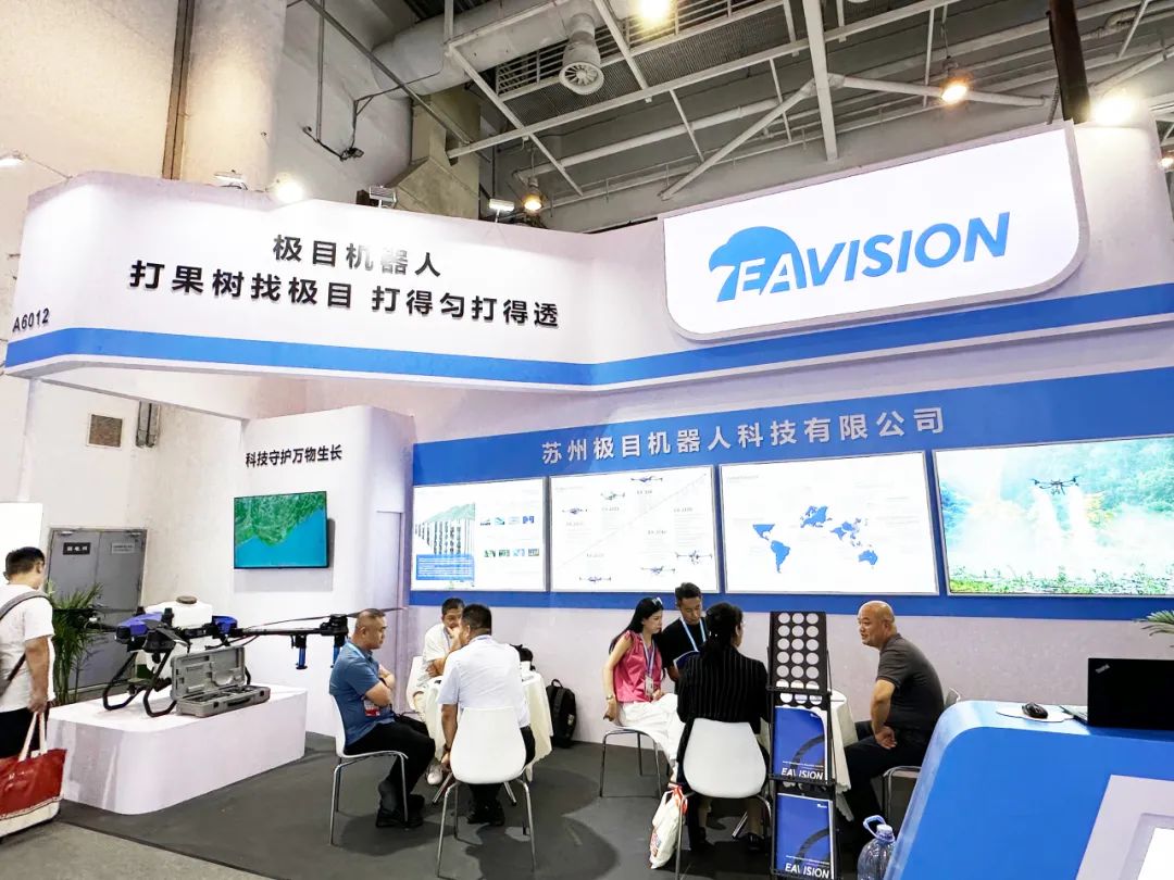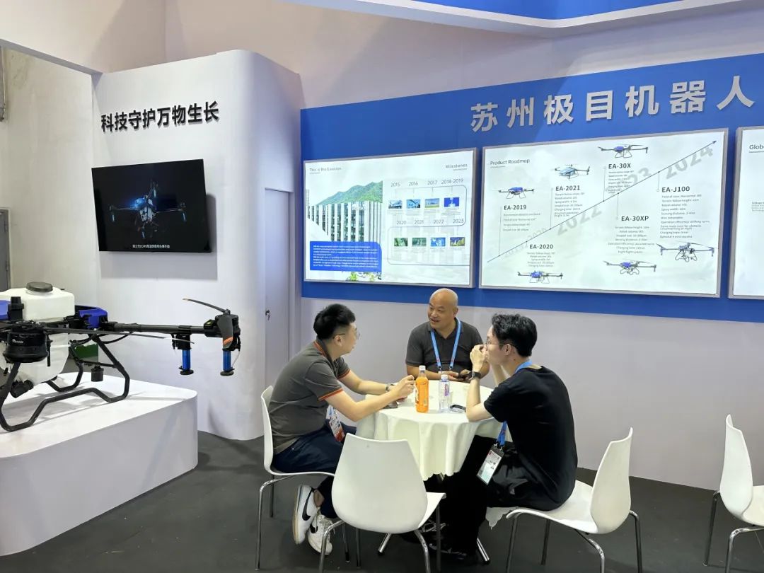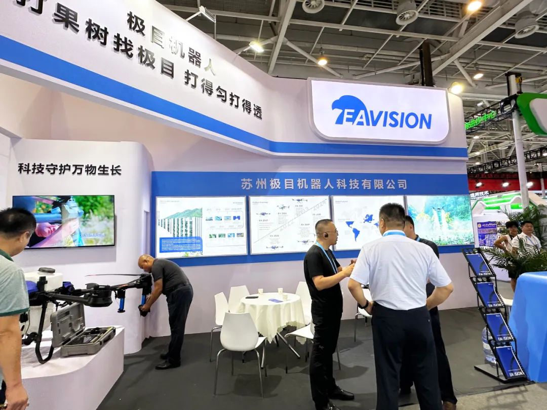 极目携产品EA-J100亮相展会。EA-J100搭载了4个常温弥雾喷头,双倍弥雾,效果翻倍,雾滴粒径最小可达10微米,并可实现10-300微米可调,可以更好的覆盖到果树叶片的背面。