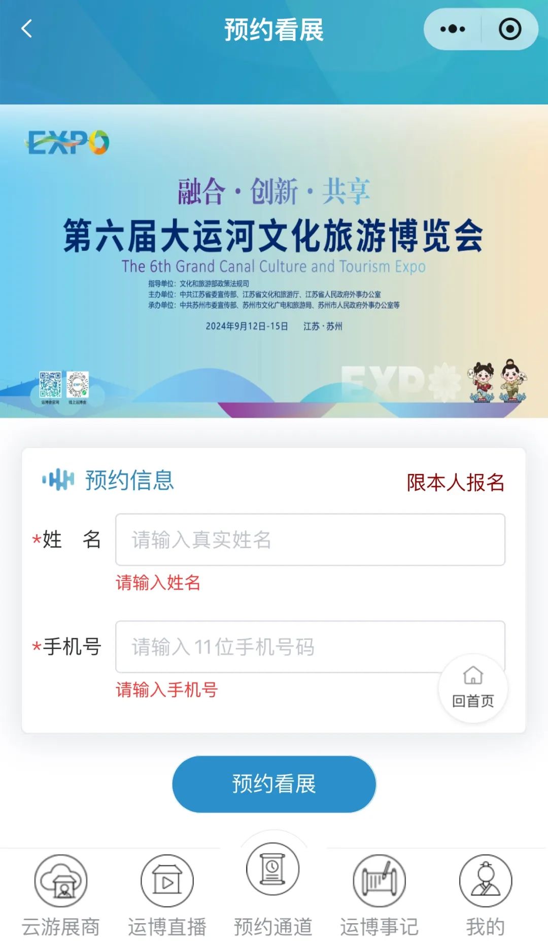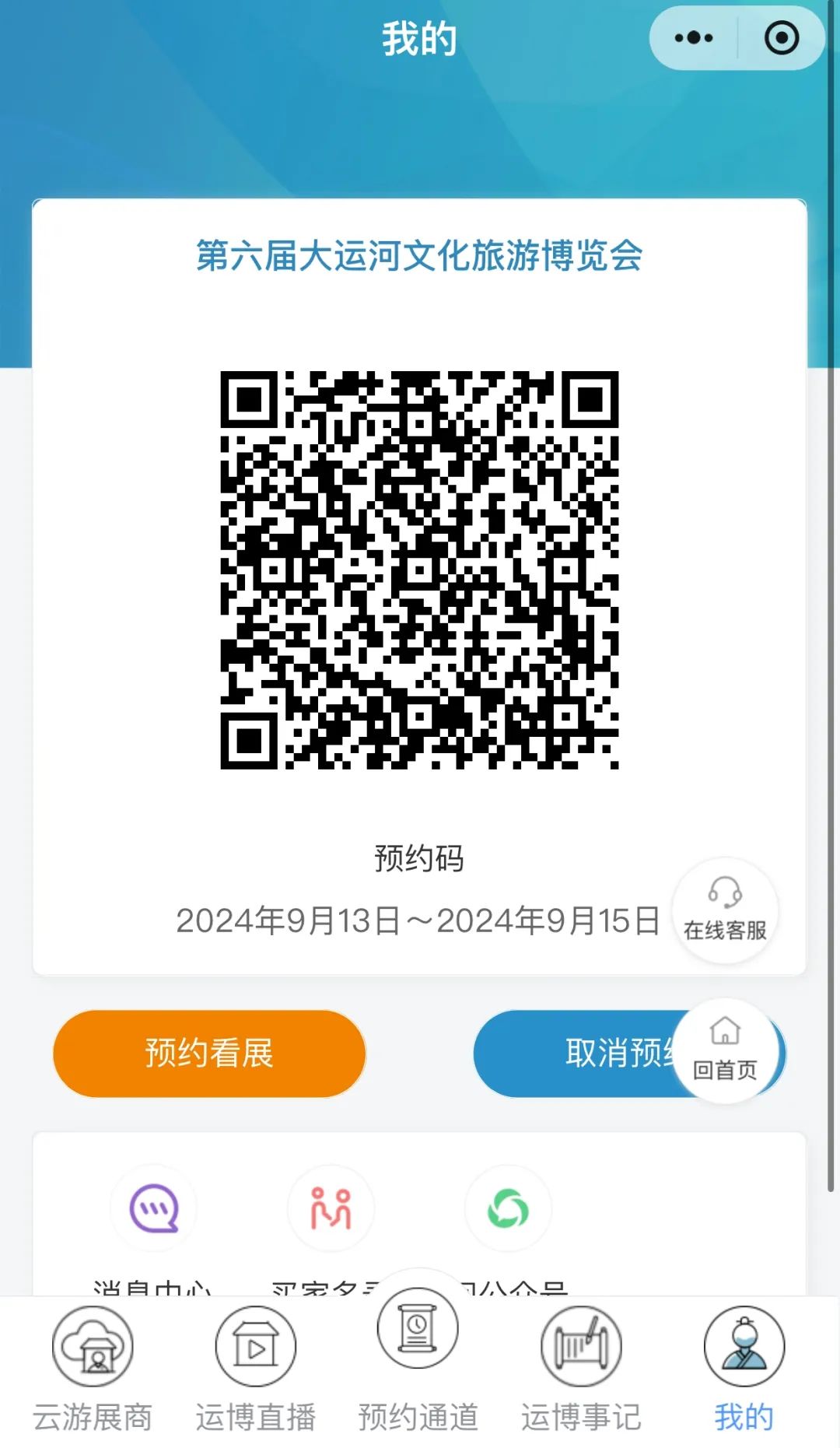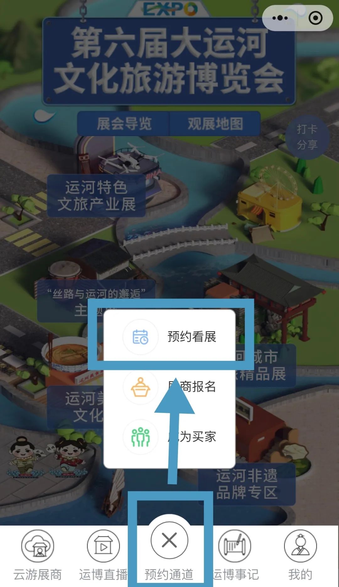 微信搜索「第六届大运河文化旅游博览会」小程序,在主页底部菜单栏点击“预约通道”中的“预约看展”即可进入预约页面。