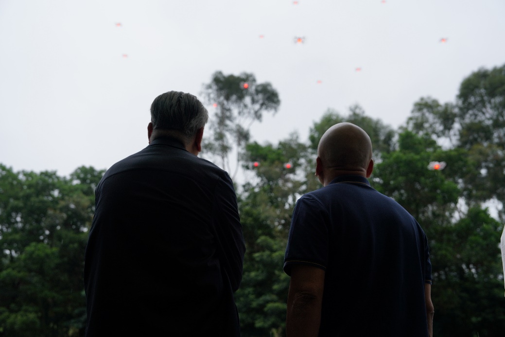 在公司广场,林左鸣理事长观看了高巨创新自主研发的无人机编队表演。表演展示了公司在无人机编队集群领域的技术优势,展现了无人机编队表演在城市宣传、文化旅游等应用场景中的广泛应用前景。林左鸣理事长表示,无人机编队不仅体现了技术创新的优势,也为丰富低空经济的应用场景提供了新的动能。