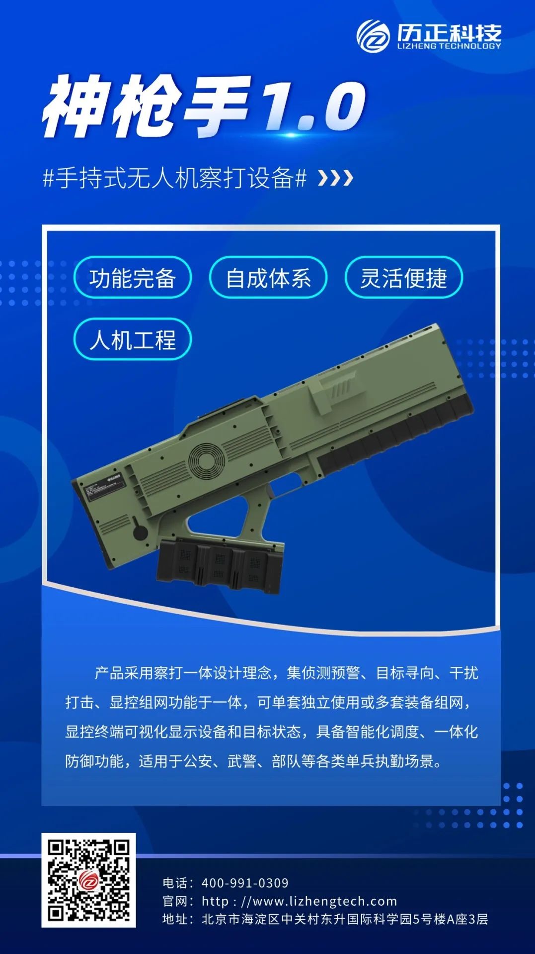 系统集无人机侦测、识别、定位、预警、监视和反制功能于一体,着重解决“低慢小”目标探测预警装备体系建设滞后、智能可靠打击干扰手段短缺、复杂天候环境应对措施不全、低空综合监管防范能力不足等问题。