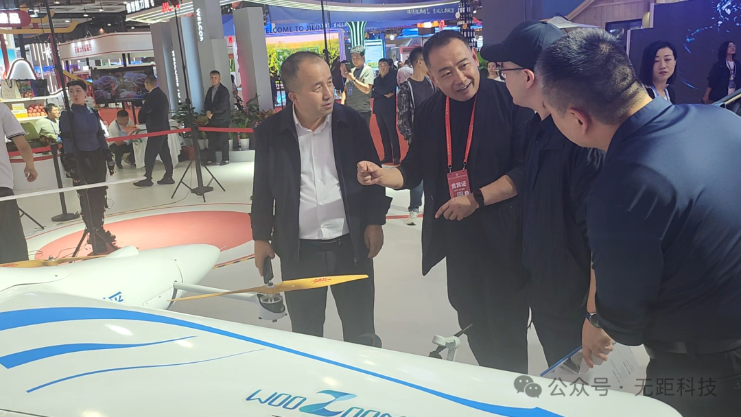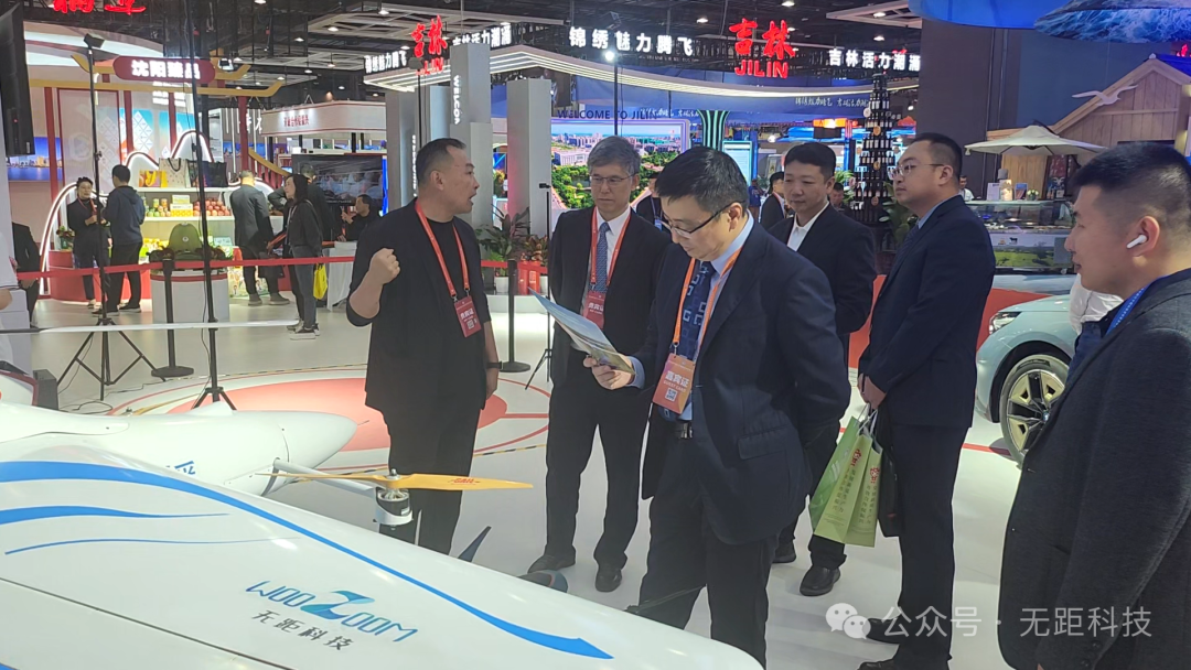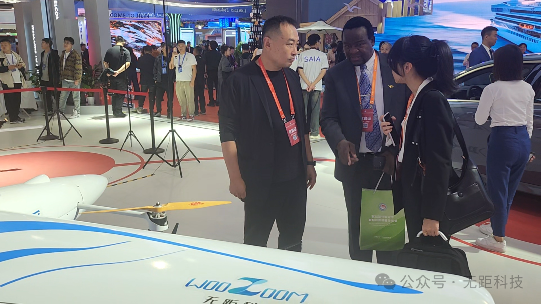 无人机展示:技术实力与广泛应用。本次展会,无距科技展出的多台无人机吸引了众多参观者的目光。常务副总李仕乙向与会的各级领导及外国商务代表详细介绍了公司的无人机产品及其在应急救援、农业植保、物流配送、城市管理等低空经济领域的广泛应用。