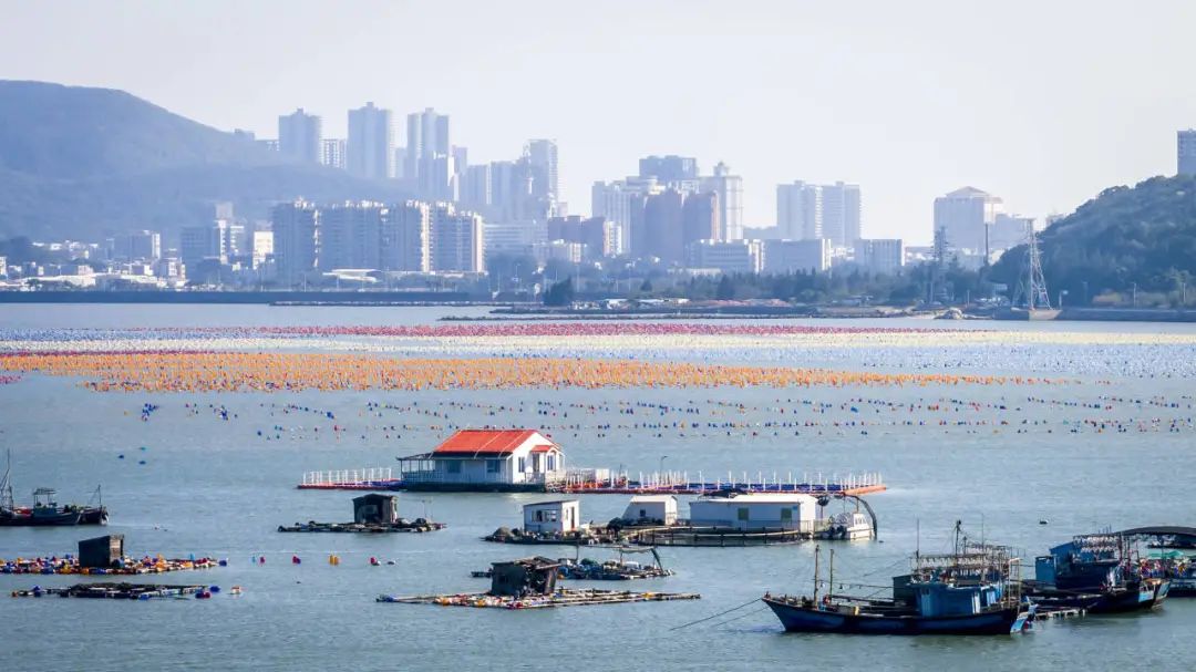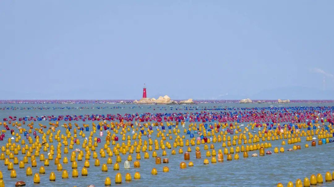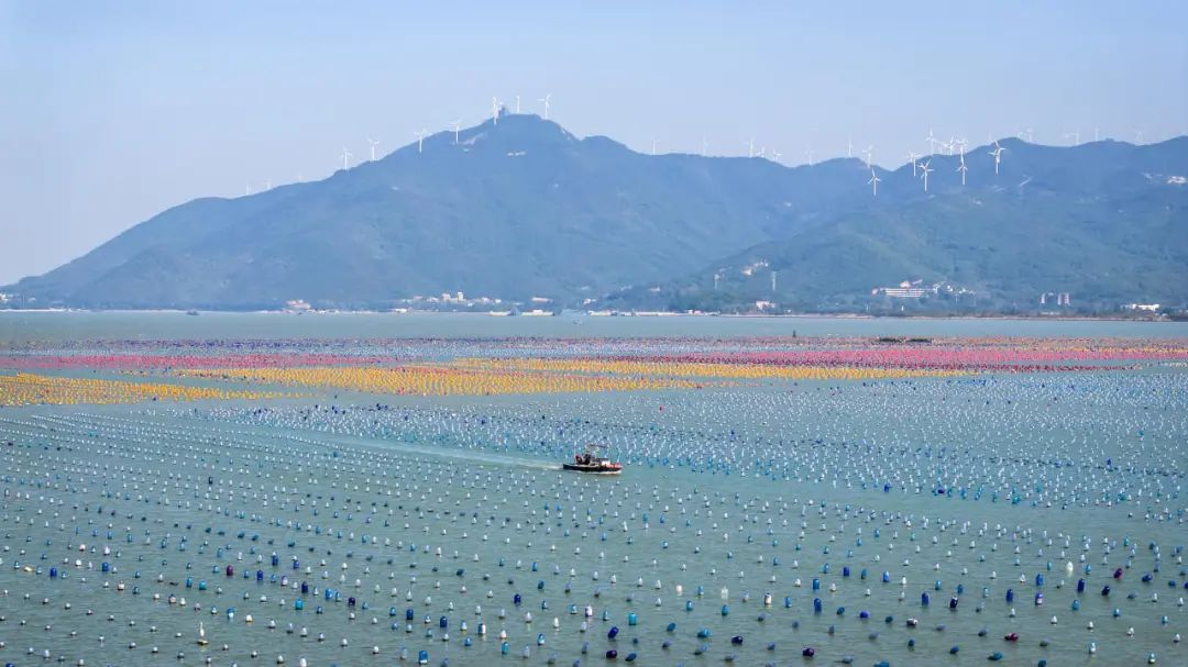 上万亩牡蛎养殖“海上牧场”采用成片可降解的彩色透明浮球进行吊养。五颜六色的浮球方阵在阳光下熠熠生辉。