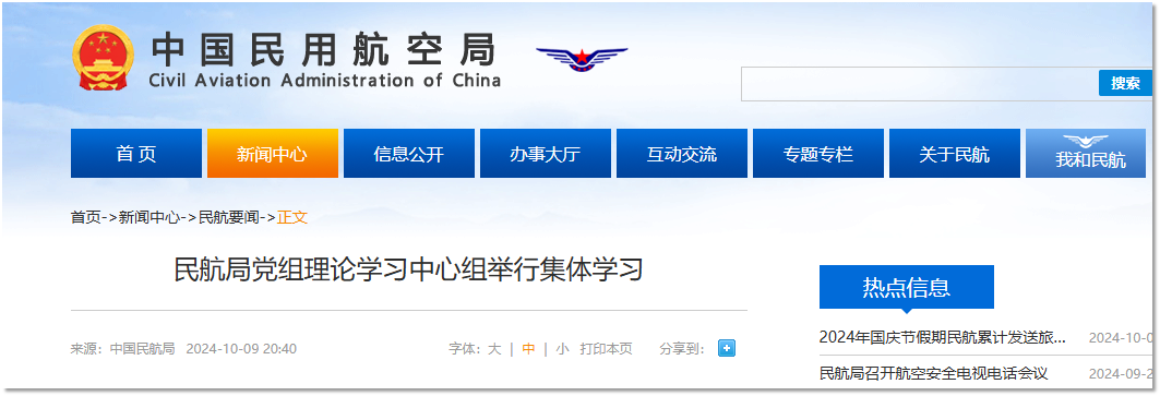 10月9日,民航局党组理论学习中心组举行集体学习,深入学习贯彻党的二十届三中全会精神,深入学习贯彻习近平总书记关于新质生产力的重要论述,推动通用航空和低空经济高质量发展。民航局党组书记、局长宋志勇主持学习并讲话,党组成员、副局长韩钧、梁楠参加学习。