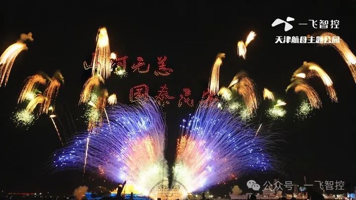 无人机在空中排列出“航空母舰” “山河无恙,国泰民安”等画面,还巧妙地变换成传统神话人物“哪吒”和“孙悟空”,以及可爱的“熊猫”等形象,向祖国传递了深情的祝福。与此同时一飞智控的无人机烟花秀品牌效应,成功为航母吸引大量游客。据统计,7天内园区接待游客16.3万人次,10月2日至6日的夜场接待量达6万人次,天津航母主题公园在文旅市场中“强势出圈”!