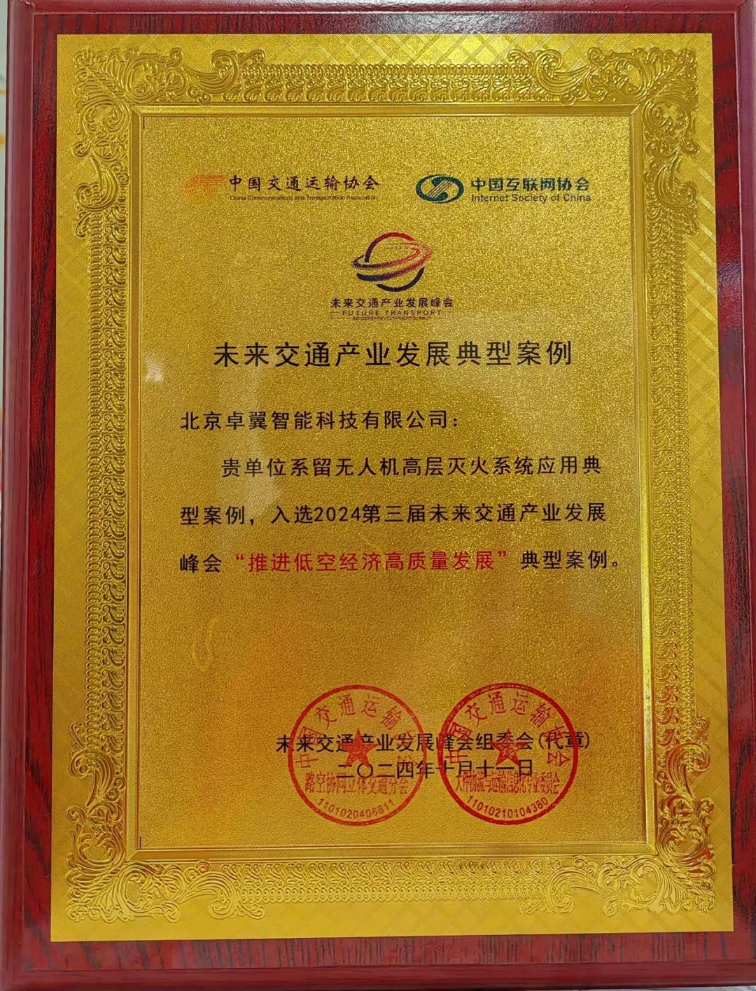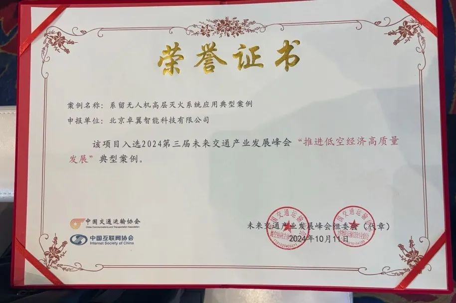 本次峰会,卓翼智能系留无人机高层灭火系统凭借其创新的技术,获得与会专家和行业代表的一致认可,成功入选典型案例。