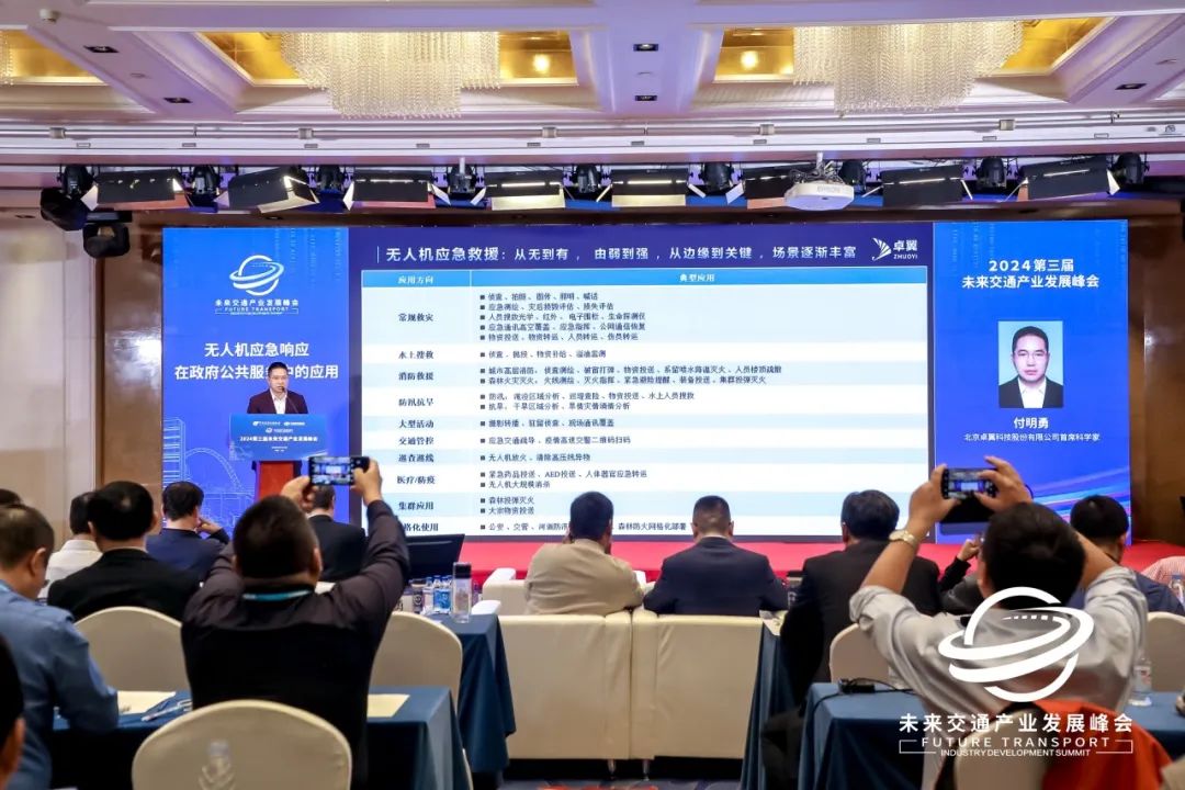 10月11日至12日,2024第三届中国未来交通产业发展峰会在北京成功举办。卓翼智能作为低空经济领域代表性企业参加第三届中国未来交通产业发展峰会。会上,公司首席行业科学家付明勇先生受邀在低空经济产业发展论坛做《无人机应急响应在政府公共服务中的应用》专题分享,卓翼智能系留无人机高层灭火系统应用入选峰会“推进低空经济高质量发展“典型案例。