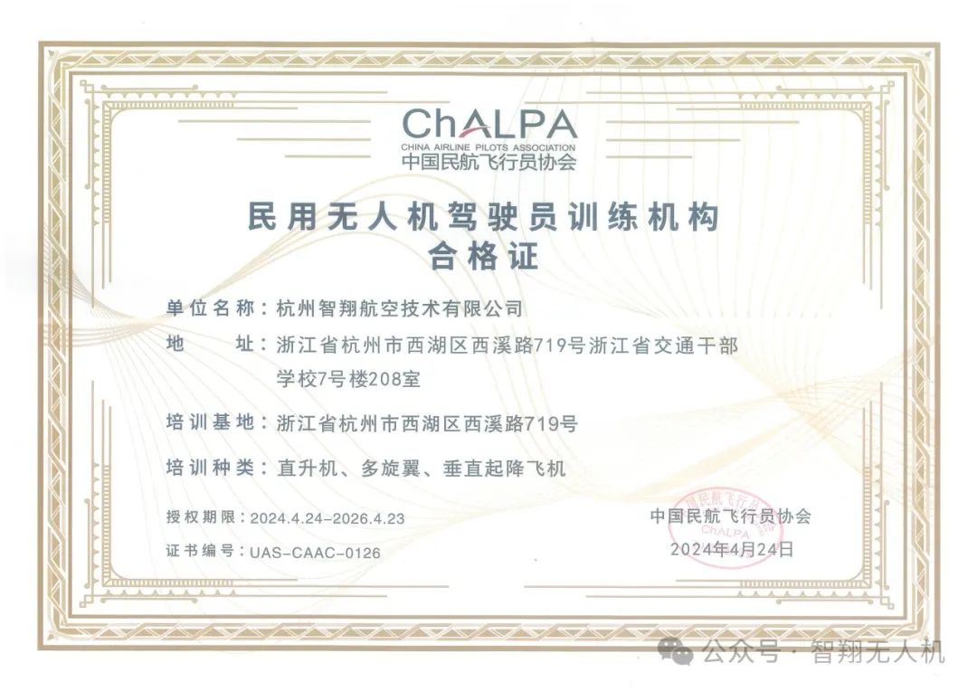 智翔航空是中国民用航空局认定的民用无人机驾驶员执照浙江省01考试点,是教育部第三方评价组织优云智翔浙江省1+X办公室,中国ALPA民用无人机系统驾驶员训练机构,中国AOPA民用无人机驾驶航空器系统驾驶员训练机构,浙江省ASFC遥控航空模型飞行员执照考核培训授权单位,慧飞UTC无人机应用技术培训中心浙江西湖分校,拥有专业的教学团队与齐全的培训机型:多旋翼无人机(小、中型),垂起固定翼无人机(小、中型);每种机型分视距内操控员、超视距操控员、教员三种类别,满足不同学员的多样化需求。