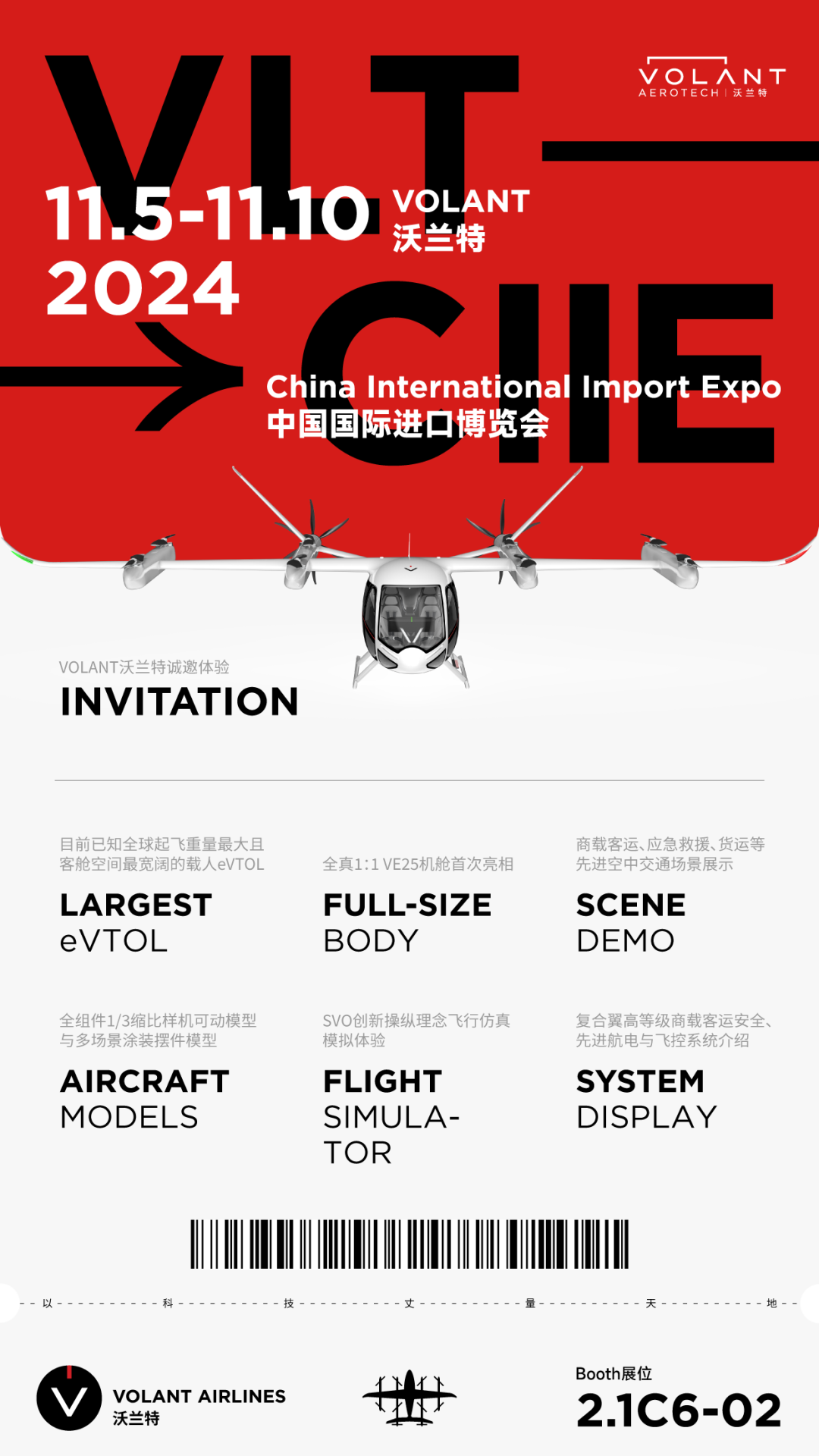 “让世界看见中国,在中国看见世界”。eVTOL作为低空经济中最具技术创新和经济增长潜力的交通工具,迎来了全面与全新的发展机遇。紧抓中国低空经济发展的政策机遇,搭乘第七届进博会搭建的国际性平台,以为人类提供安全、绿色、高效且商业可行的高等级客运eVTOL为己任,沃兰特航空再次诚挚邀请您莅临展台2.1C6-02,共同见证空中出行时代的到来!