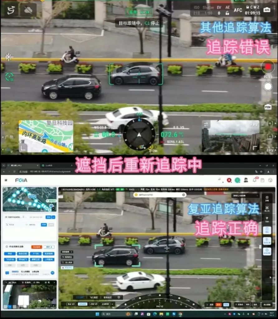 在长时间遮挡带来的挑战下,传统的追踪算法依赖于目标的连续视觉信息,难以维持追踪的连续性和准确性。而复亚智能对无人机目标追踪自研算法进行了深度的优化升级,确保持续追踪正确目标。