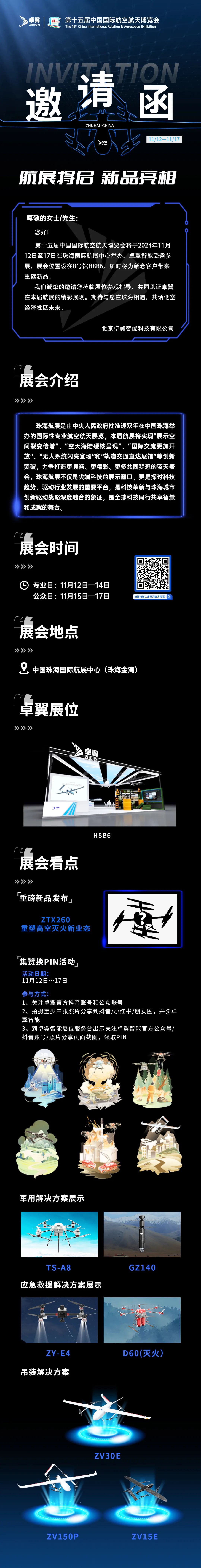 2024年11月12日至17日,第15届中国国际航空航天博览会将在广东珠海隆重举行。卓翼智能将以“军事安防+低空应急”为核心亮相,展会期间,卓翼智能将依托多种构型的无人系统装备,向观众展示军事防务、应急救援、应急通信、应急照明、森林灭火、消防救援、智慧巡检等的“AI+无人机”解决方案,全面展示我们在军工和低空经济领域的技术成果,这些技术成果也将为未来的应急安全和国防安全提供更有力的技术支撑。