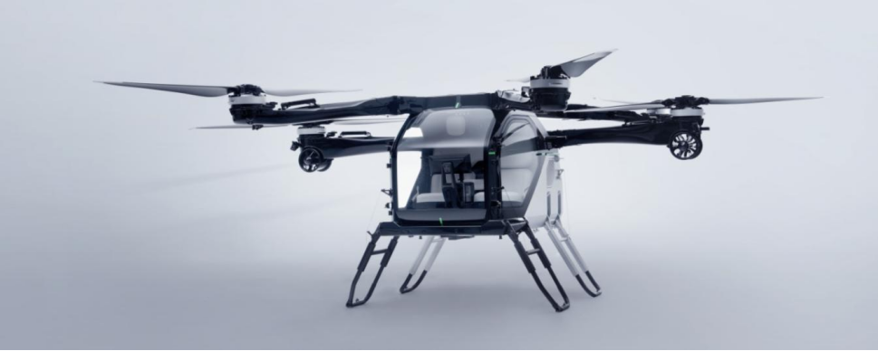 飞行器为六旋翼双涵道的创新构型,机身主体结构和桨叶采用碳纤维材料,兼顾高强度和轻量化。270°全景座舱,为用户提供开阔的飞行视野。