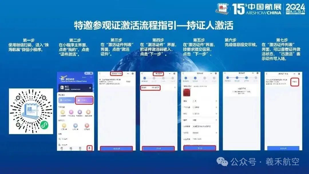 展会时间 专业日:2024年11月12-14日 公众日:2024年11月15-17日 展会地点 珠海国际航展中心 12号馆 H12A7 回顾第十四届中国航展的羲禾航空: 官方攻略 了解官方购票攻略: 请点击链接:航展门票正式开售!购票攻略请收下! 了解官方交通攻略: 请点击链接:第十五届中国航展专业日(珠海国际航展中心)交通指南 嘉宾须知 关于嘉宾证 专业日(单次)特邀参观证件有效期及入场时间: 单日单次有效,激活即生效,入场即作废; 证件使用者须年满18周岁,请随身携带身份证件,以备查验。 激活流程如下: 温馨提醒:特邀参观证一旦激活即生效,无法挂失换证,请谨慎激活,在入场前一天扫描证件上的二维码激活即可。 关于参展商证 专业日、公众日参展商证件有效期及入场时间: 温馨提醒:所有入场人员必须持有效证件方可进入展区。证件不得转让或转借他人。如有遗失,不予补发,请妥善保管,建议随身携带身份证件,以备查验。 关于羲禾 安徽羲禾航空科技有限公司是一家专业从事航空螺旋桨、航空复材结构研发与生产的高新技术企业、专精特新企业。拥有完善的制造资质和完备的人才团队,已成为多家大型央企与科研院所的合格供应商,承担了多个国家重大项目、重点型号的配套研制工作。 公司在定距螺旋桨、电动变距螺旋桨、液压变距螺旋桨、涵道螺旋桨等方面拥有多型谱成熟产品,可实现从小型航模发动机到大型涡桨发动机的全面匹配,可根据需求进行专业的桨发、桨机匹配设计,全面释放飞行性能。已实现多款型号飞机的列装,技术成熟,性能可靠。