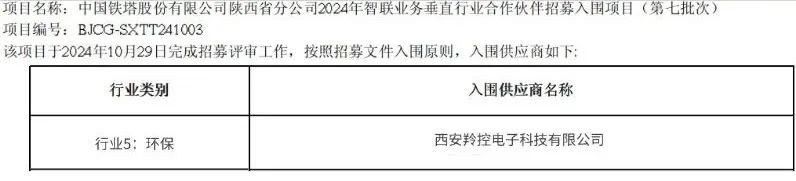 近日,经严谨细致的资质审核和全面深入的能力评估,羚控科技成功入围中国铁塔股份有限公司陕西省分公司2024年智联业务垂直行业合作伙伴招募项目(第七批次),本次入选的行业类别为环保。