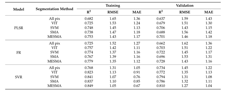 结果表明:(1)利用4种影像分割方法去除土壤和阴影等背景干扰,可以提高光谱信息提取精度,其中MESMA分割后的影像计算的植被指数与棉花冠层叶绿素含量相关性提高最多;(2)在三种不同飞行高度下,采用MESMA方法分割的多光谱影像计算的植被指数作为输入变量,SVR模型在反演棉花叶绿素含量精度最优,R²分别为0.810、0.778和0.697;(3)在80米飞行高度下,结合SVR模型和四种分割方法得到的棉花SPAD反演精度与原始影像相比,R²分别提高了2.2%、5.8%、13.7%和17.9%。因此,采用MESMA混合像元分解方法可有效去除多光谱影像中的土壤和阴影,尤其为 提高混合像元较多的低分辨率影像农作物生理参数反演精度提供参考。