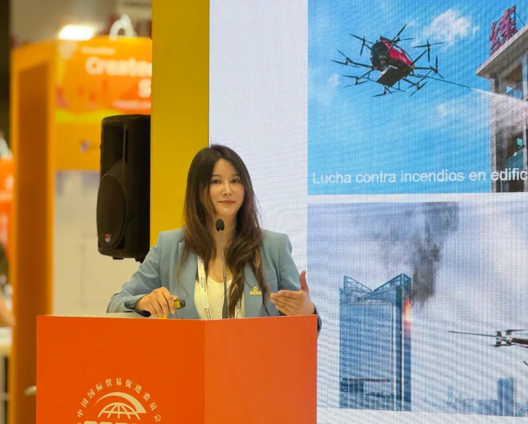亿航智能欧洲及拉丁美洲首席运营官向静女士在大会首日中国展区开放论坛开幕式上,发表了题为《亿航智能如何引领全球城市空中交通变革和低空经济产业发展》的主旨演讲,与来自全球世界各地的观众分享亿航智能世界领先的技术、城市空中交通智慧、创新、环保的解决方案,以及全球飞行和发展的足迹与经验。