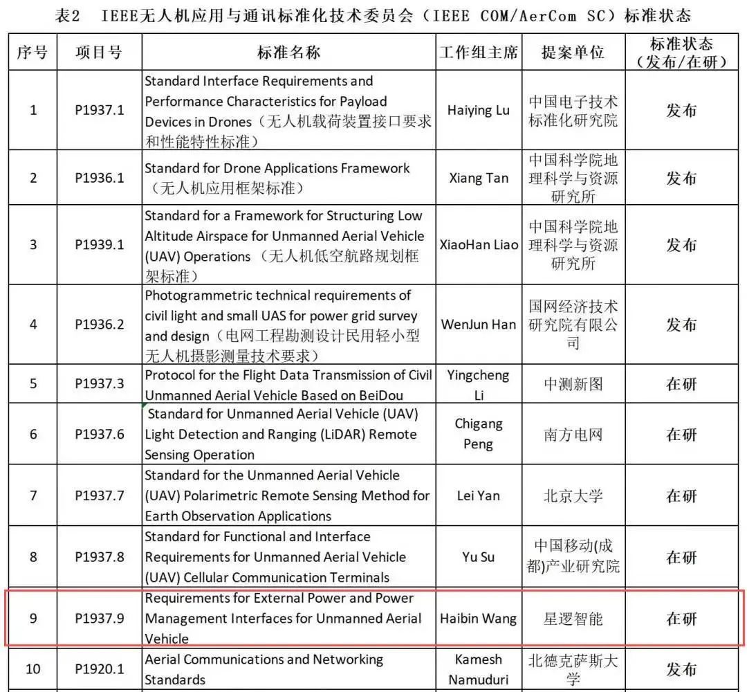 ·IEEE 1937.1全球首个无人机载荷接口标准:此标准由中国电子技术标准化研究院牵头,星逻智能深度参与。该标准规定了无人机与载荷之间接口的通用要求,从机械、电器和数据传输三个角度对无人机载荷接口要求进行了分析,明确了接口的性能指标、操作控制和管理、环境适应性、电磁兼容性等要求,这标志着我国无人机标准向国际迈进,开始赢得与产业发展水平相适应的国际话语权。