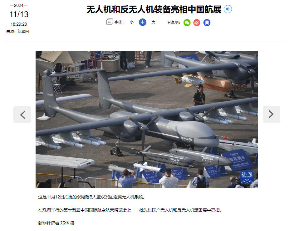 据不完全统计,本届航展期间,国内外媒体总计报道腾盾无人机6000余次,其中国内省级以上媒体1400余次,更吸引了新华社、中央广播电视总台等央级媒体的高度关注,全网浏览量过亿,点赞量过百万。