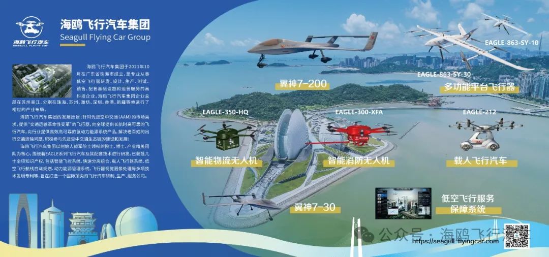 海鸥飞行汽车集团,专业从事研制“能跑-会飞”的飞行汽车和低空飞行服务保障系统,业务范围涵盖:飞行汽车、低空飞行服务保障系统、航电系统、自动驾驶系统、三维视景导航地图系统、动力电池系统、航空发动机等;并提供支持航空运营的配套服务:技术咨询和服务、航空运输、民用航空器维修、培训及零部件设计和生产、飞行员培训等支持航空运营的配套服务;旨在打造国际顶尖的飞行汽车研制、生产、服务公司。