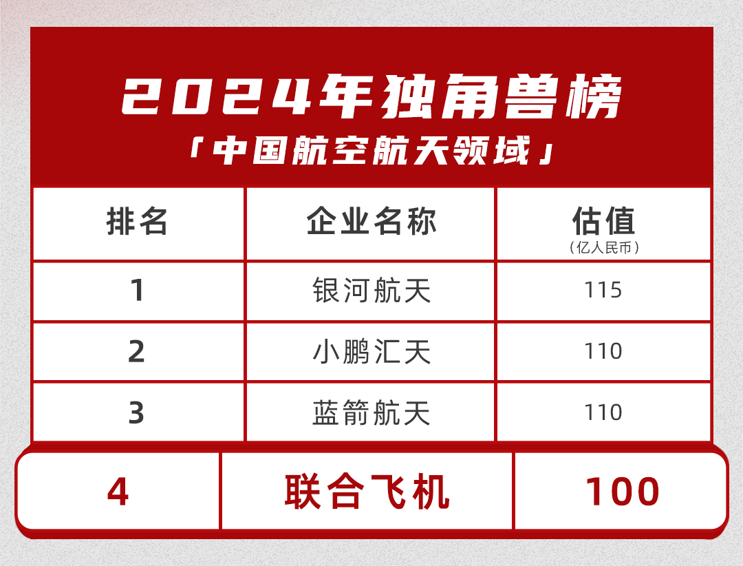 根据这份榜单的统计,中国2024年的独角兽总规模达到8.4万亿,集中于五大城市:北京、上海、杭州、广州、深圳。在行业分布上,虽然现在前十大独角兽主要来自社交媒体、电子商务、金融科技、游戏、消费电子行业,但硬科技赛道将是未来十年独角兽高速发展领域,航空航天作为先进技术和新质生产力进步的代表,被列为值得关注的独角兽新领域。在这个值得关注的独角兽新领域中,联合飞机以100亿的估值跻身中国航空航天领域TOP4!