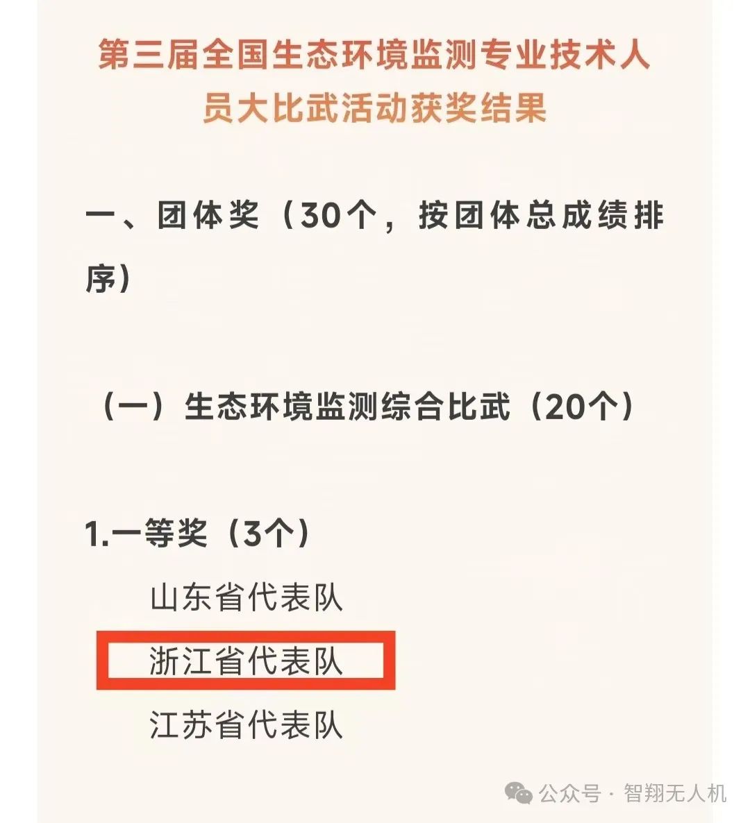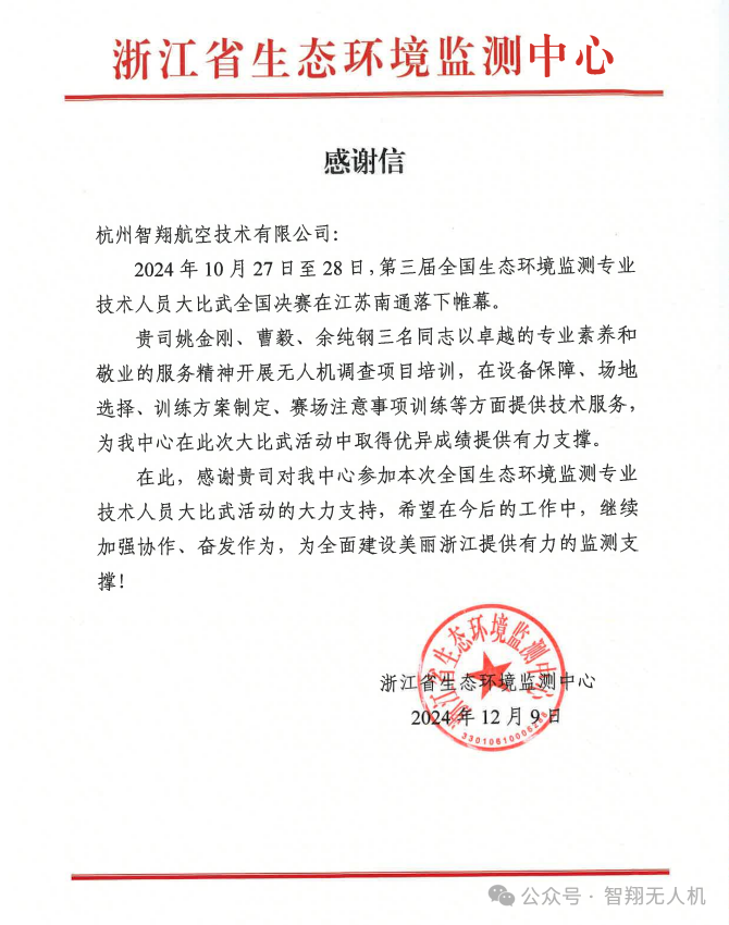 智翔航空姚金刚、曹毅、余纯钢三名同志以卓越的专业素养和敬业的服务精神开展无人机调查项目培训,在设备保障、场地选择、训练方案制定、赛场注意事项训练等方面提供技术服务,为浙江省生态环境监测中心在此次大比武活动中取得优异成绩提供有力支撑,助力浙江省代表队荣获团体一等奖,专门发来感谢信!