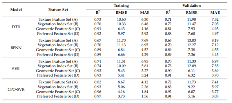 通过利用四旋翼无人机搭载MS600 Pro V1多光谱相机采集了2023年向日葵幼苗期的多光谱影像,结合可见光数据,提取了多光谱植被指数、几何特征和纹理特征。基于单一数据源和多源数据,利用决策树(Decision tree regression,DTR)、神经网络回归算法(back propagation neural network,BPNN)、支持向量机回归算法(support vector regression,SVR)和冠豪猪优化支持向量机算法(crested porcupine optimizer support vector regression,CPO-SVR)构建了向日葵株数估测模型,对比各模型在不同数据源下的反演效果,分析发现多源数据下的模型较好的估测了向日葵出苗数量,其中CPO-SVR模型估测精度最好,在测试集中,CPO-SVR模型的R2为0.94,RMSE为5.16,MAE为3.03。