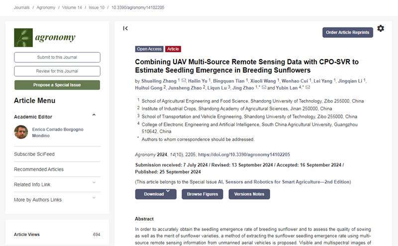 山东理工大学农业工程与食品科学学院赵静团队在《Agronomy》发表了题为“Combining UAV Multi-Source Remote Sensing Data with CPO-SVR to Estimate Seedling Emergence in Breeding Sunflowers”的研究论文。