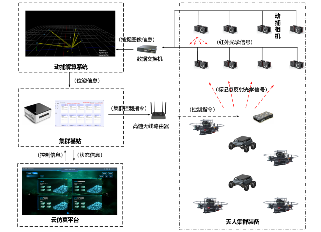 本项目以飞思云仿真平台为核心控制平台,通过集群控制基站作为中转枢纽,对光学动捕环境下的无人机及仿真无人智能体模型,实现虚实融合环境下的无人系统集群协同算法验证。