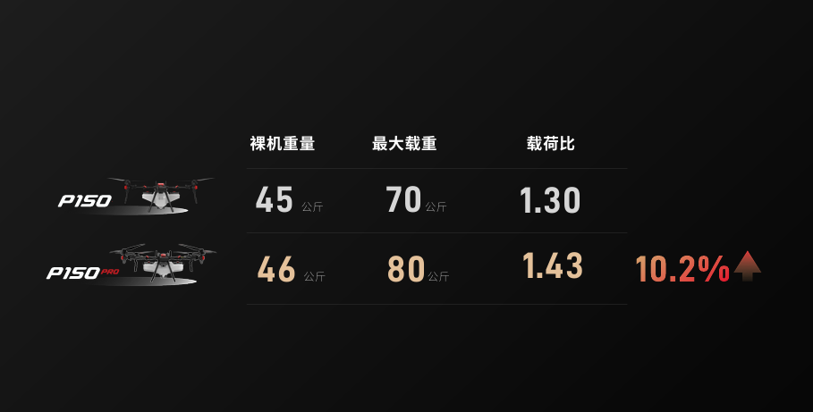 同时,P150 Pro 进一步优化机身结构材料,一边“减重”,一边“加强”,提升整机强度与耐用性。对比 P150,P150 Pro 仅增加了 1 公斤的裸机重量,就实现了 10 公斤的载荷提升,带来 80 公斤最大载重,在法规范围内还有提升空间。可以大胆地说,P150 Pro 是目前行业内载荷比最好的无人飞机。