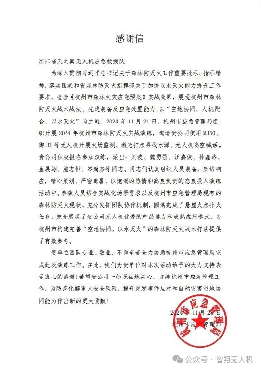 12月19日,杭州市应急管理局给浙江省天之翼无人机应急救援队发来一封感谢信,对救援队在杭州市应急管理局组织开展的2024年杭州市森林防灭火实战演练活动中,全力开展配合的相关工作给予了充分肯定,并对救援队刘波、魏勇强、汪嘉俊、孙鑫路、 金展翊、施志恒、岑超杰等同志进行表扬。在这次以“空地协同、人机配合、以水灭火”为主题的演练活动中,浙江省天之翼无人机应急救援队凭借其卓越的专业能力和无私奉献精神赢得广泛赞誉。