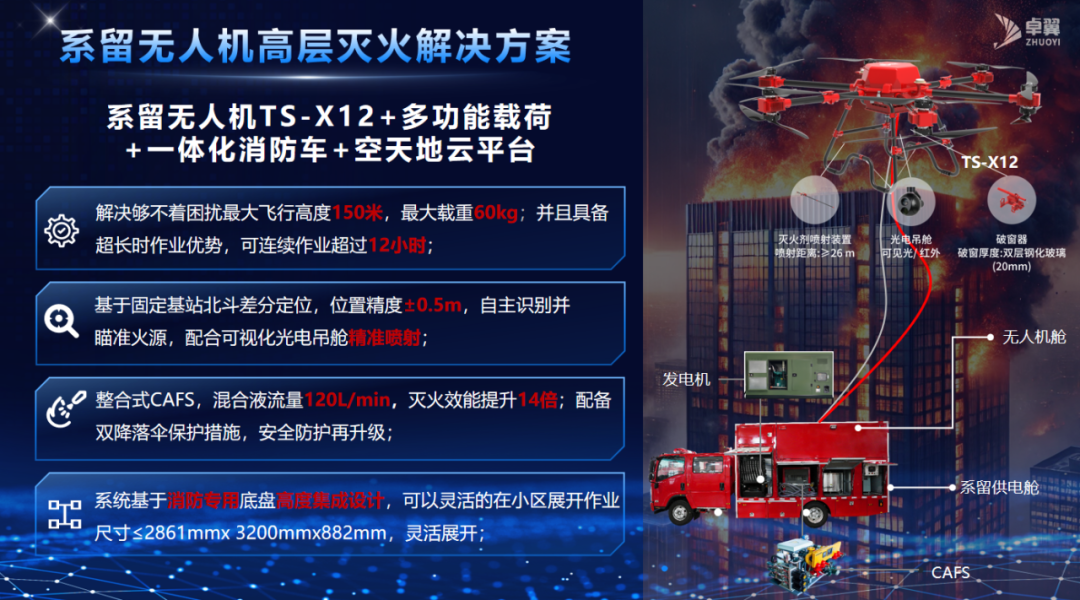 在面对复杂多变的高烈度环境应急任务时,卓翼智能提供了一整套全面且高效的解决方案。该方案的核心优势在于其强大的适应性和卓越的技术性能,确保了无人机在极端条件下的稳定运行和高效作业。而TS-X12超大载重特种智能系留无人机凭借其独特的优势和技术特点,也成为应对高烈度环境挑战的理想选择,为各种应急响应任务提供了坚实保障。