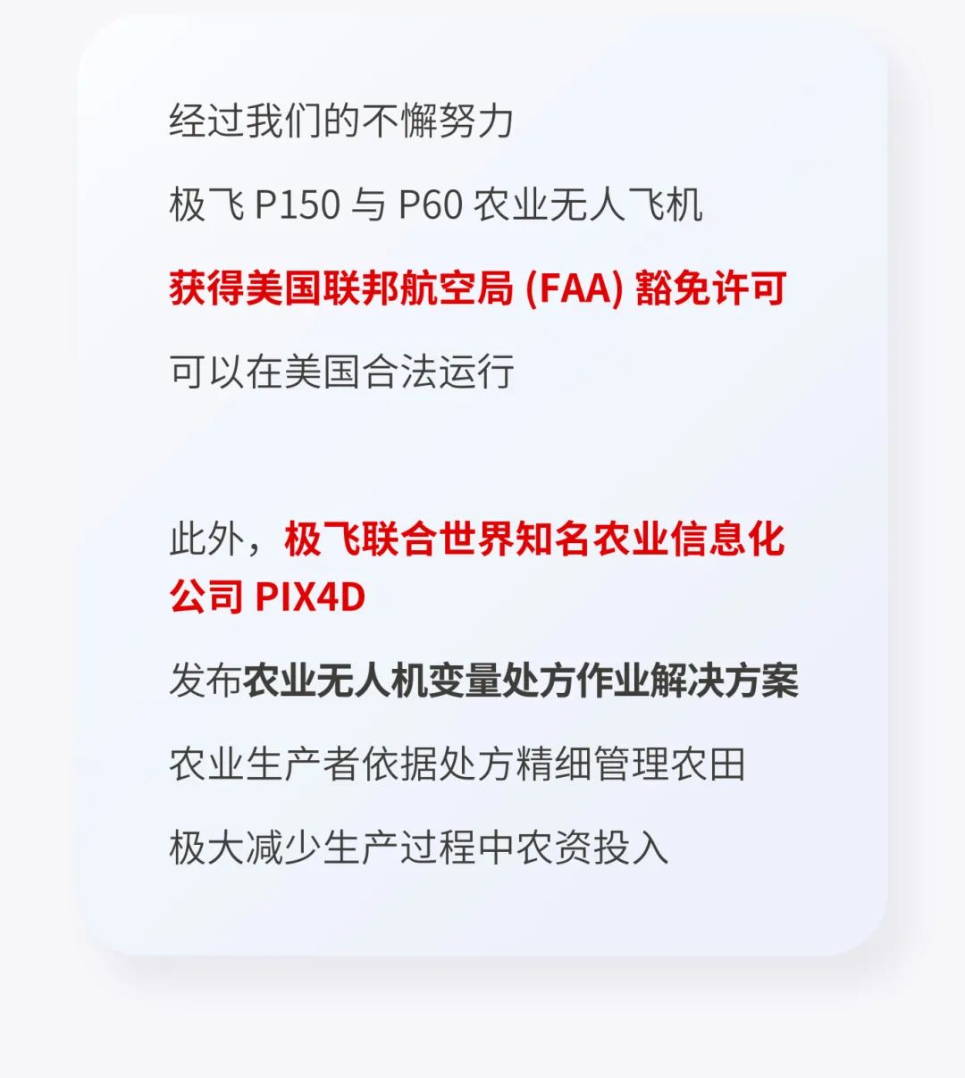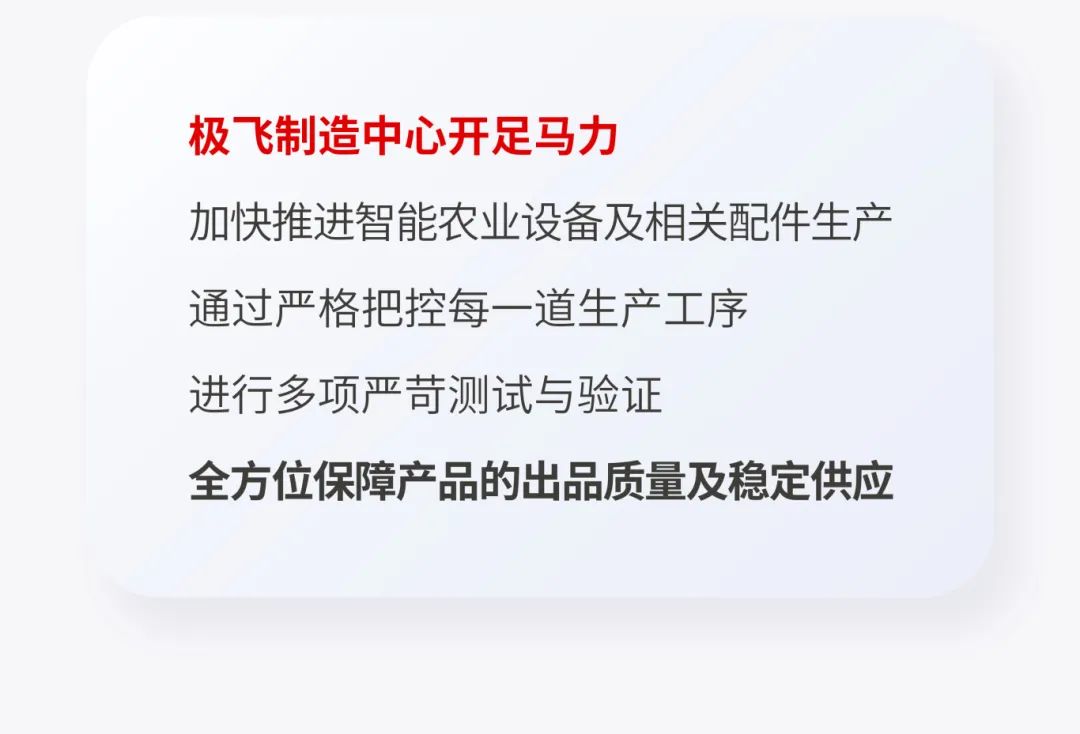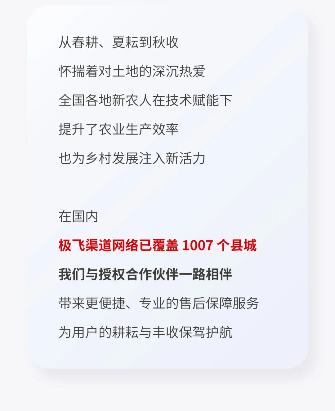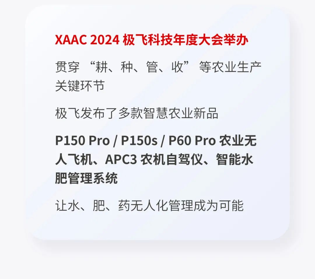 极飞的愿景是,构建一个满足人类未来 100 年发展需求的农业生态系统,让全世界的人们都能获得充足、丰富和安全的食物。成立 14 年来,极飞自主研发了农业无人机、农业无人车、农机自驾仪、农业物联网和智慧农业管理系统等产品。通过构建完善的渠道体系,为农户提供智能、高效、经济的生产工具和数据服务;帮助农场解决劳动力成本高、生产管理粗放等问题。