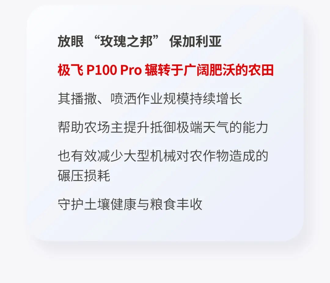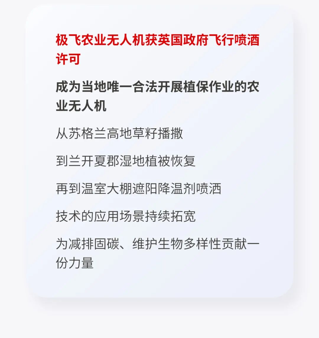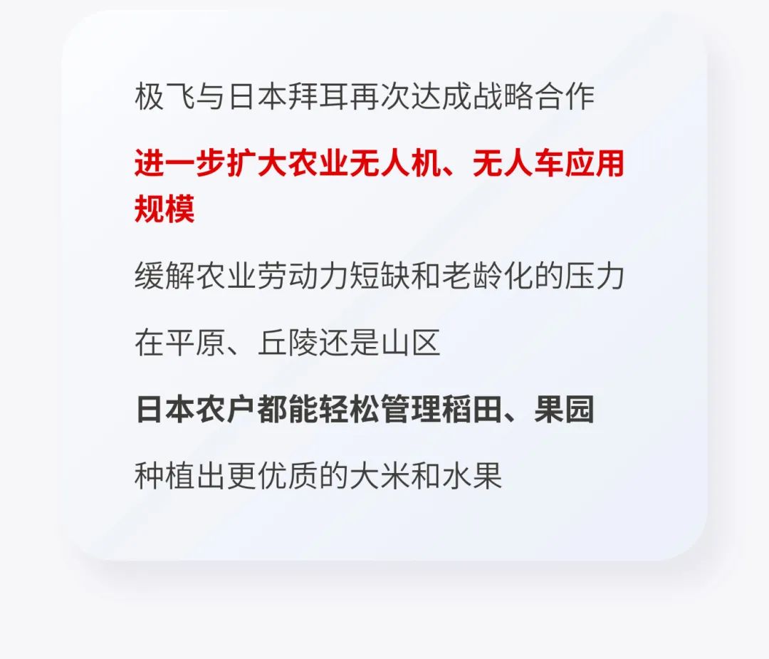 极飞的愿景是,构建一个满足人类未来 100 年发展需求的农业生态系统,让全世界的人们都能获得充足、丰富和安全的食物。成立 14 年来,极飞自主研发了农业无人机、农业无人车、农机自驾仪、农业物联网和智慧农业管理系统等产品。通过构建完善的渠道体系,为农户提供智能、高效、经济的生产工具和数据服务;帮助农场解决劳动力成本高、生产管理粗放等问题。