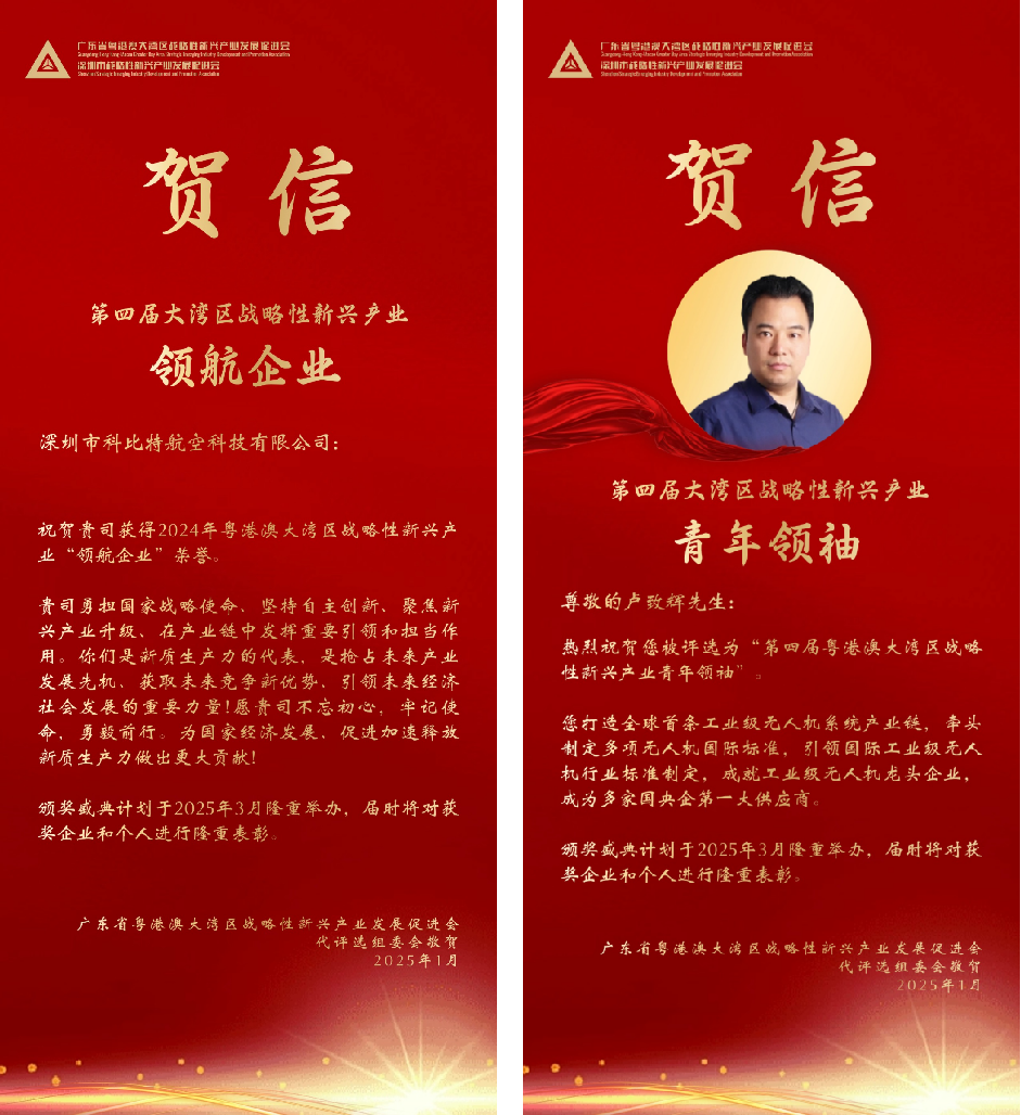深圳,2025年1月 —— 在近日公布的2024年大湾区战略性新兴产业领航企业暨第四届大湾区战略性新兴产业“拓荒人物”、“青年领袖”评选结果中,科比特航空及其创始人卢致辉分别被授予“领航企业”和“青年领袖”荣誉称号。