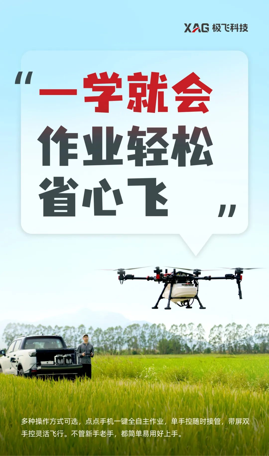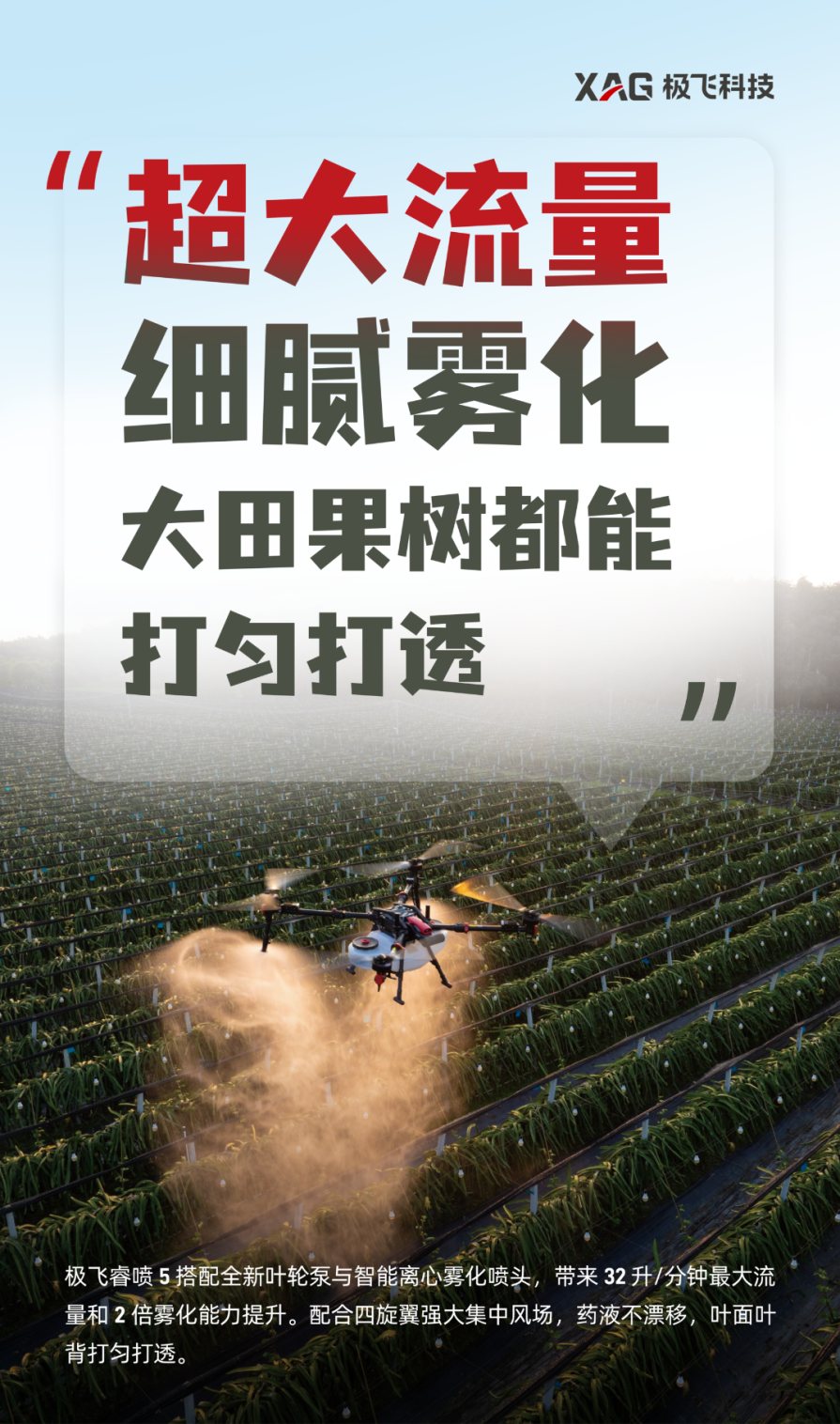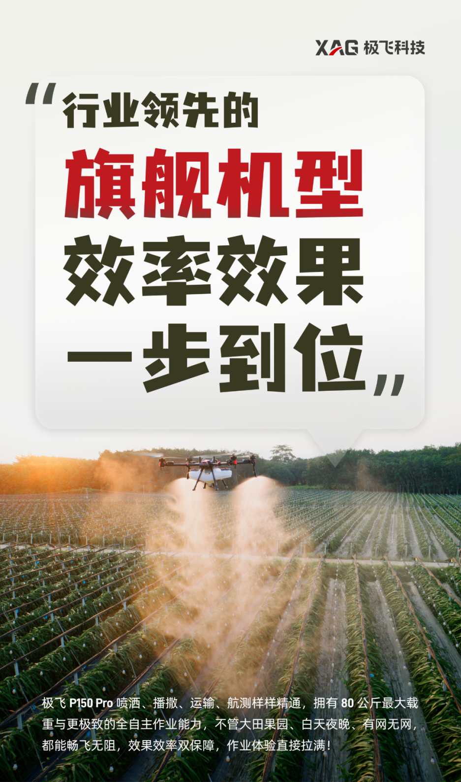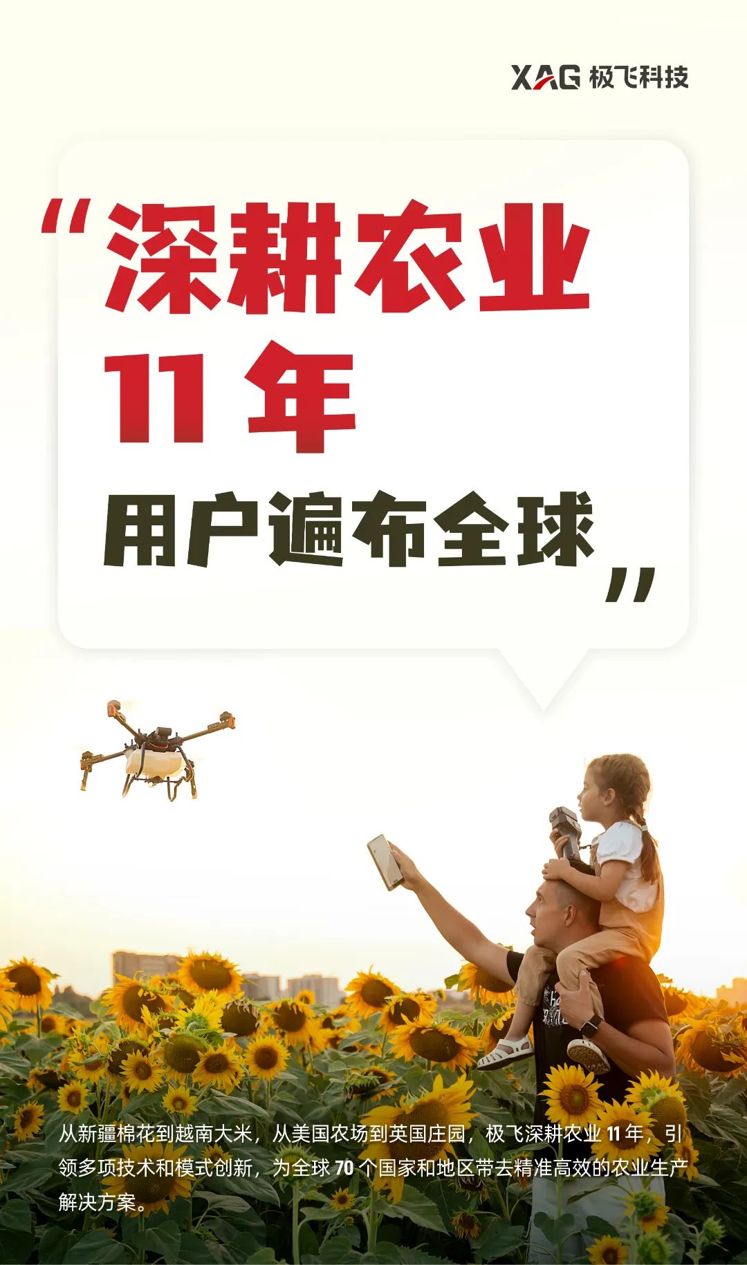 极飞的愿景是,构建一个满足人类未来 100 年发展需求的农业生态系统,让全世界的人们都能获得充足、丰富和安全的食物。成立 14 年来,极飞自主研发了农业无人机、农业无人车、农机自驾仪、农业物联网和智慧农业管理系统等产品。通过构建完善的渠道体系,为农户提供智能、高效、经济的生产工具和数据服务;帮助农场解决劳动力成本高、生产管理粗放等问题。