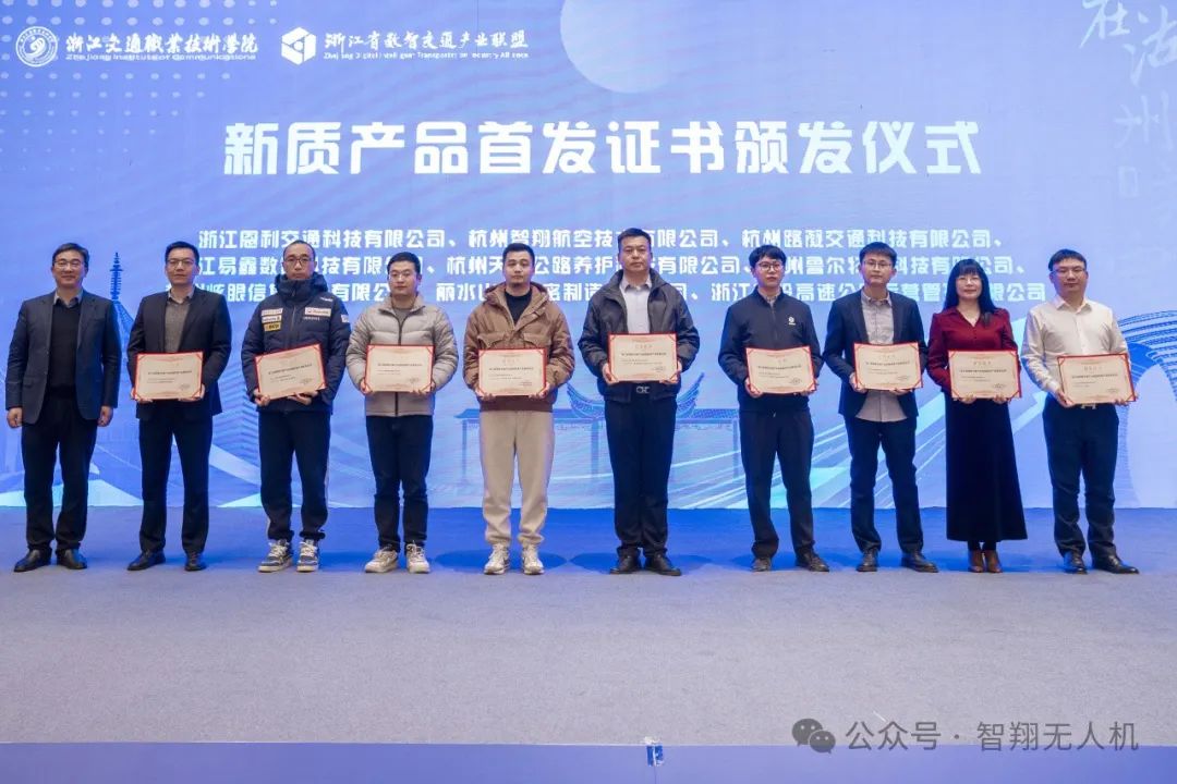 此外,旨在鼓励技术创新和新产品开发,大会还为杭州智翔航空技术有限公司等九家企业颁发了“新质产品首发证书”,以表彰这些企业在推动交通领域新技术应用方面的杰出成就。杭州智翔航空自主研发的“无人机内河通航巡航应用平台”凭借创新的技术和卓越的低空场景应用效果,引起了与会者的广泛关注。该平台以无人机为核心,融合了无人机机库、无人机飞控平台、数据处理中心、AI 算法仓库以及业务管理平台等先进技术和设备,将预警数据与业务平台相结合,形成了业务处置闭环,实现了“线上+线下”协同执法。