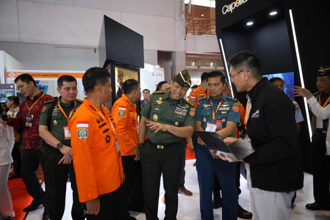 图为印尼灾害管理局和国家搜救局政府官员在首届印尼国际应急展参观巡馆