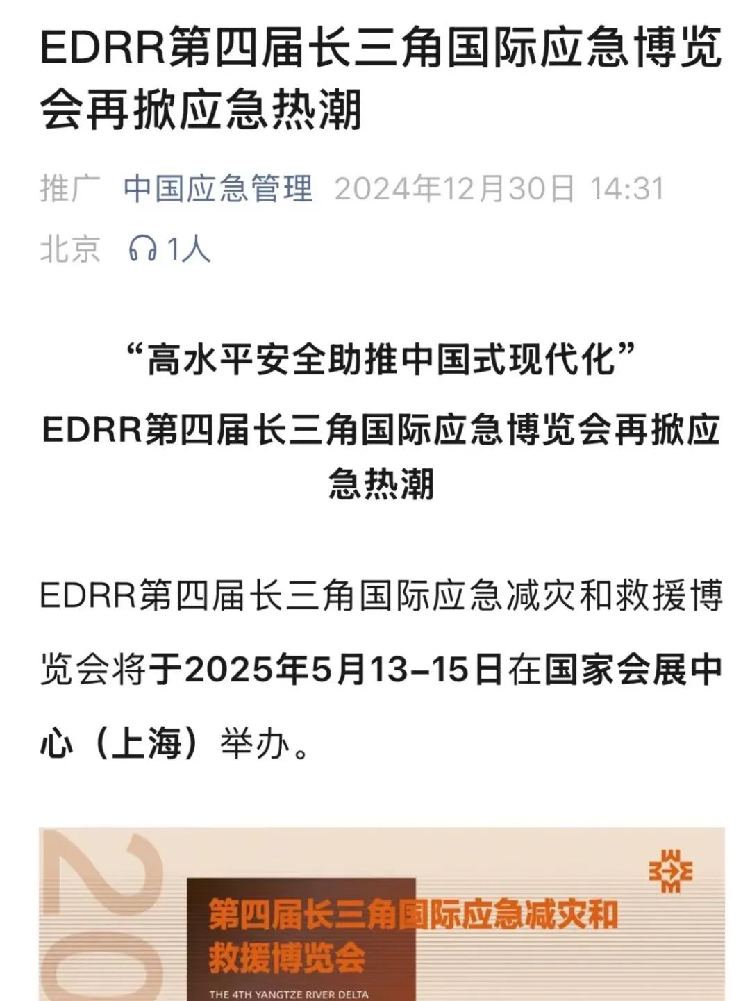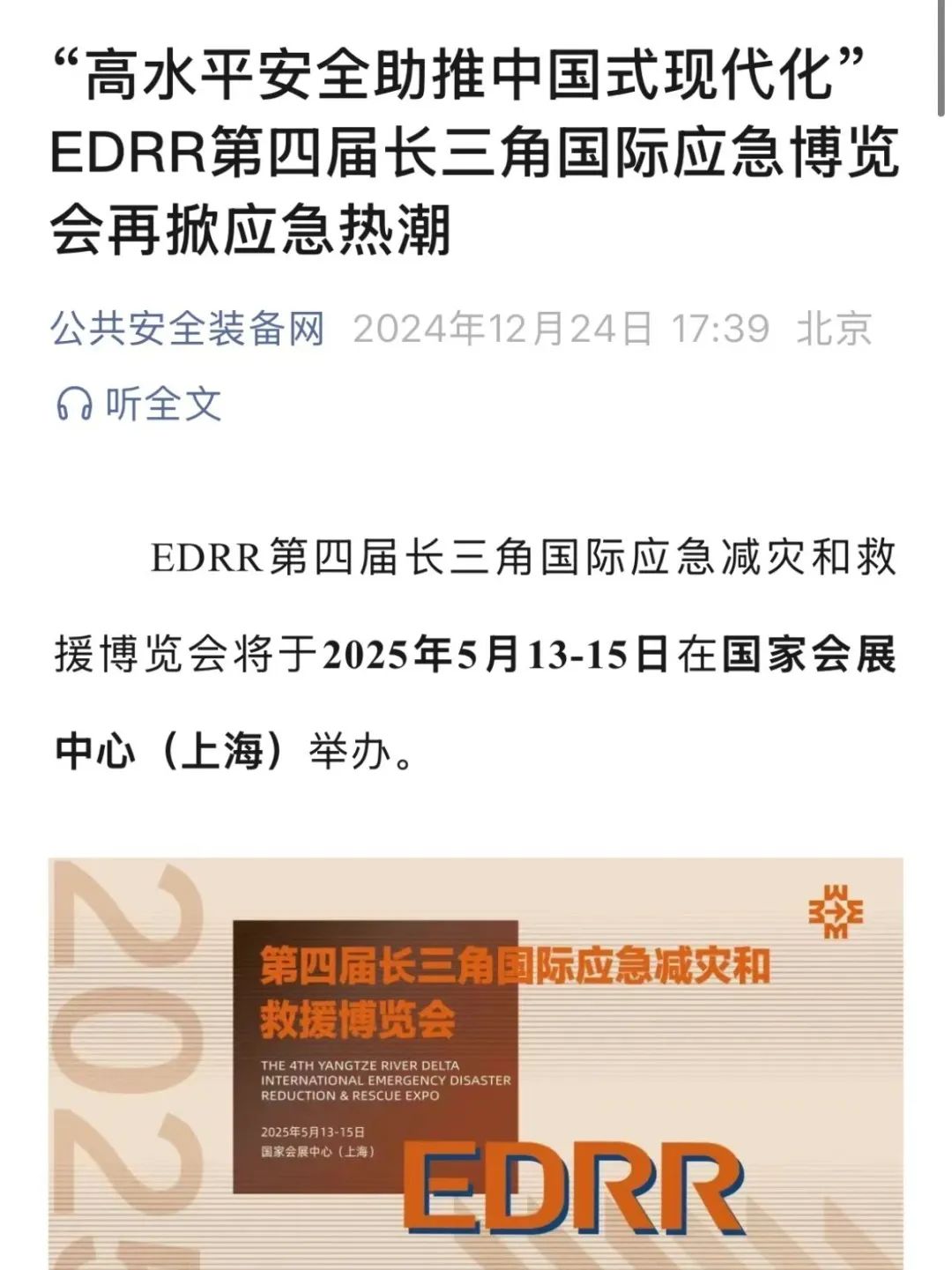 由沪苏浙皖三省一市应急管理厅局和上海市贸促会共同主办的EDRR第四届长三角国际应急减灾和救援博览会将于2025年5月13-15日在国家会展中心(上海)举办。
