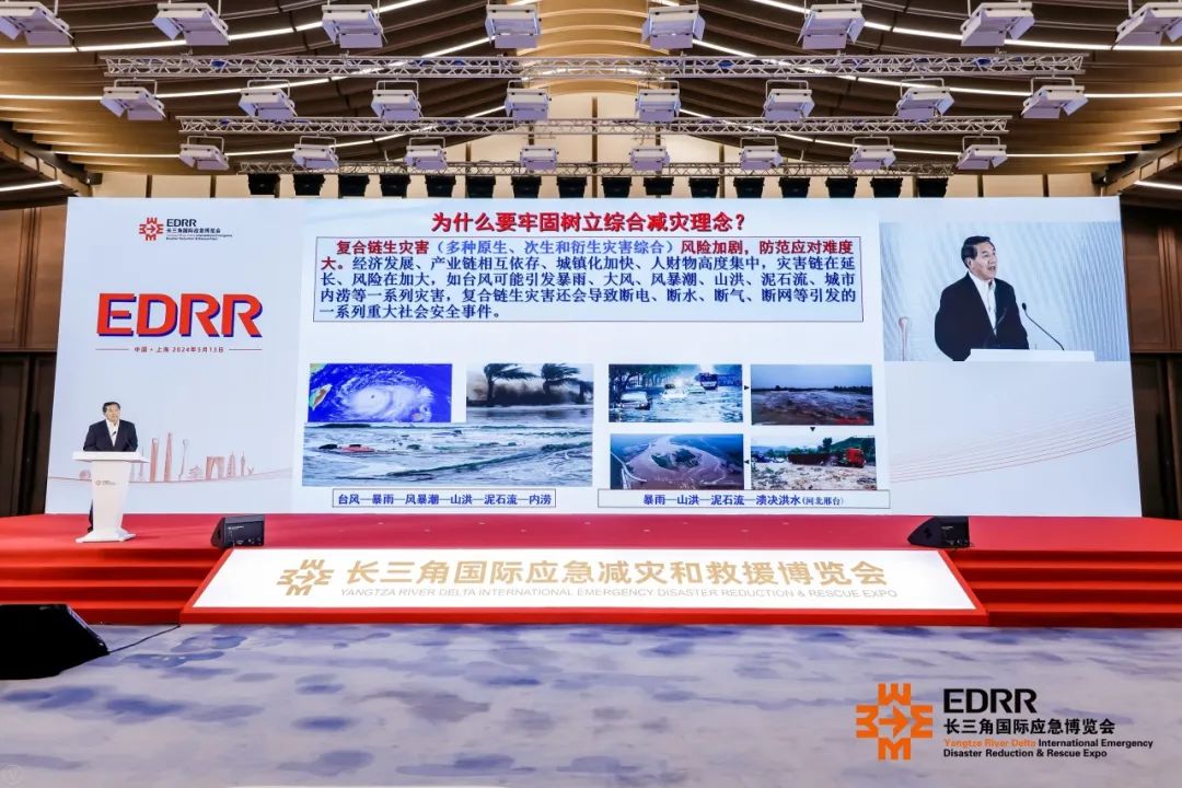 图为中国灾害防御协会会长郑国光在EDRR第三届长三角国际应急博览会上做主题演讲
