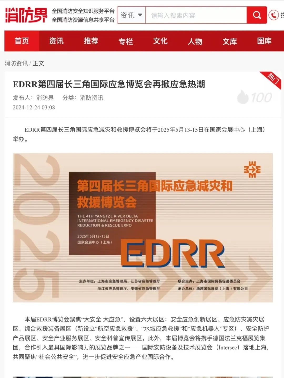 2024年举办的第三届EDRR长三角国际应急博览会,展示规模达6万平方米,吸引了超过500家参展商和近8万人次专业观众共襄盛会。应急管理部、三省一市应急管理厅局领导出席开幕活动、进行参观巡馆。全国近百个地市、央企应急相关业务负责人出席各类活动,参与供需对接。近20家企业进行了展会现场技术路演,展商媒体专访156场,近百家企业代表在各类活动上进行发言分享。新华社、人民日报、中央广播电视总台新闻联播节目等全国近百家媒体持续关注报道,媒体总曝光量超过10亿次。