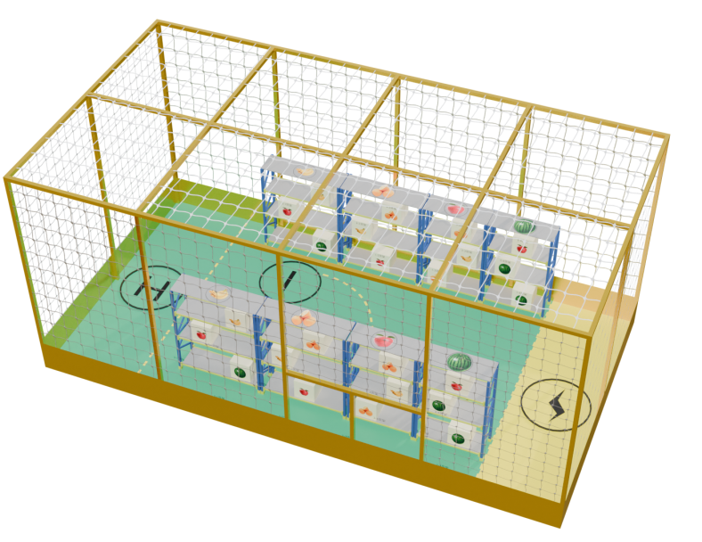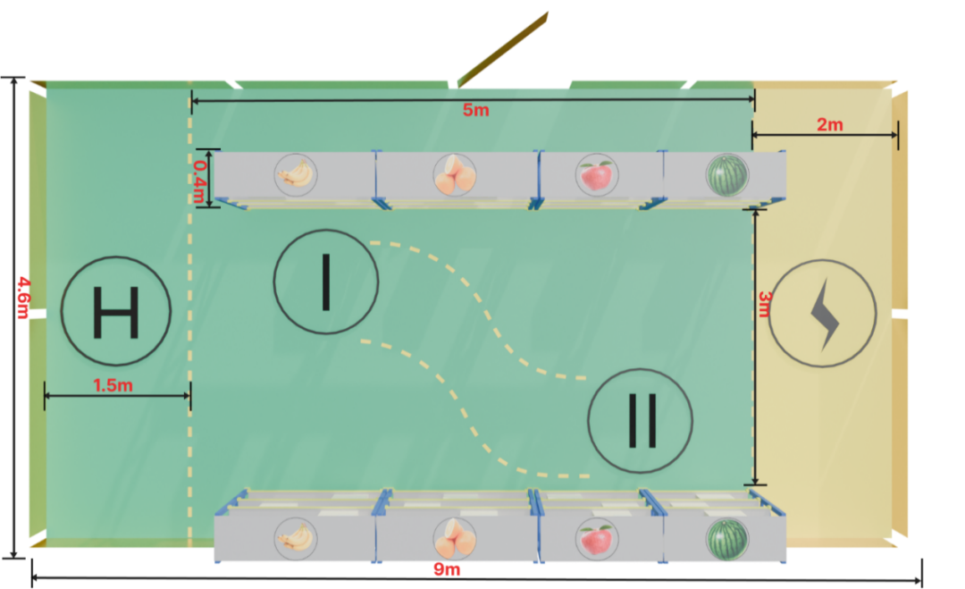 长 9 米、宽 4.6 米的区域,赛场外围有上边沿距离赛场地面高度为 4 米的围挡。赛场内设有启动/终止区、货物架和无人机充电区。场地及道具有可能存在些许尺寸误差,比赛队伍需适应场地表面可能存在的轻微起伏或褶皱。