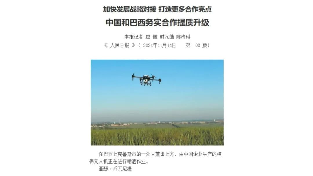 2024年中国国家领导人访问巴西,考察期间实地到访巴西圣保罗州上克鲁斯市最大的甘蔗合作社之一。负责人茱莉亚说道:“自从引进中国企业生产的无人机(极目无人机)后,我们的喷洒效率大大提高,以前难以到达的区域现在也可以轻松管理了。”