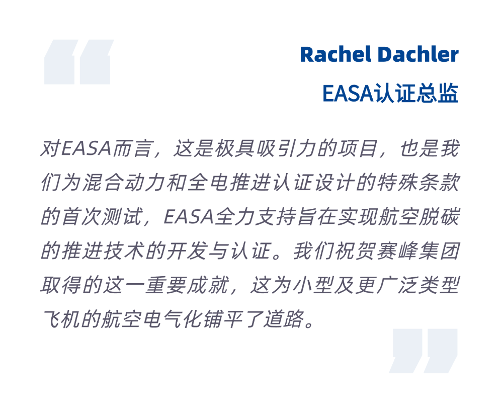 该电机的取证基于1500小时的电机认证测试以及在真实飞机环境下开展的超过100小时的飞行测试。这是携手EASA四年合作的成果,期间双方共同确立了电动推进系统的具体适航规章,并为其准确评估与认证设计完善的方法。