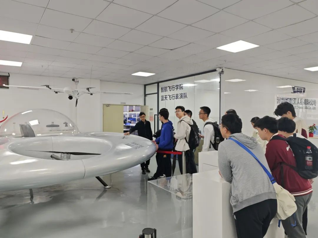 随后,在智航品牌总监余鹏的带领下,实践支队参观了公司展厅。同学们围着公司的明星产品--全球首款载人飞碟eVTOL展开了热烈的讨论。“这造型太炫酷了,飞碟的主要应用场景在哪些地方啊”、“当初公司为什么会选择研发一款这么独特的载人飞行器呢?”、“飞碟的外形有哪些优势和技术难点呢?”,同学们的问题层出不穷,在得到相应的解答和双方充分交流后,同学们对智航飞碟展现出极大的认可和期待。