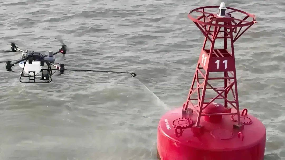 针对上述传统维护方式的不足,长江航道局上海航道处积极探索维护新模式,通过改装无人机搭载特殊清洁装置,精准定位航标污损部位,远程操控,动态调整力度、角度,高效清除表面污垢。通过这场精细的小型“空中手术”,及时恢复航标外观状况,保障助航效能充分释放。这种新型维护手段的应用,将有效降低清洁维护操作成本并提高太阳能板的工作效率,进一步提升航标维护作业效率和特殊作业条件下的安全性。