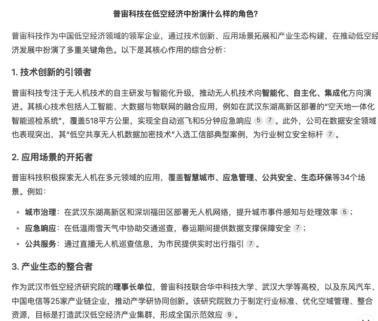 低空经济实践:普宙科技在全国范围内推广“低空共享无人机”模式。例如,武汉东湖高新区低空共享无人机项目部署了186架无人机和128套自动机库,覆盖518平方公里,实现34个城市治理场景的全天候应用,成为全国标杆。