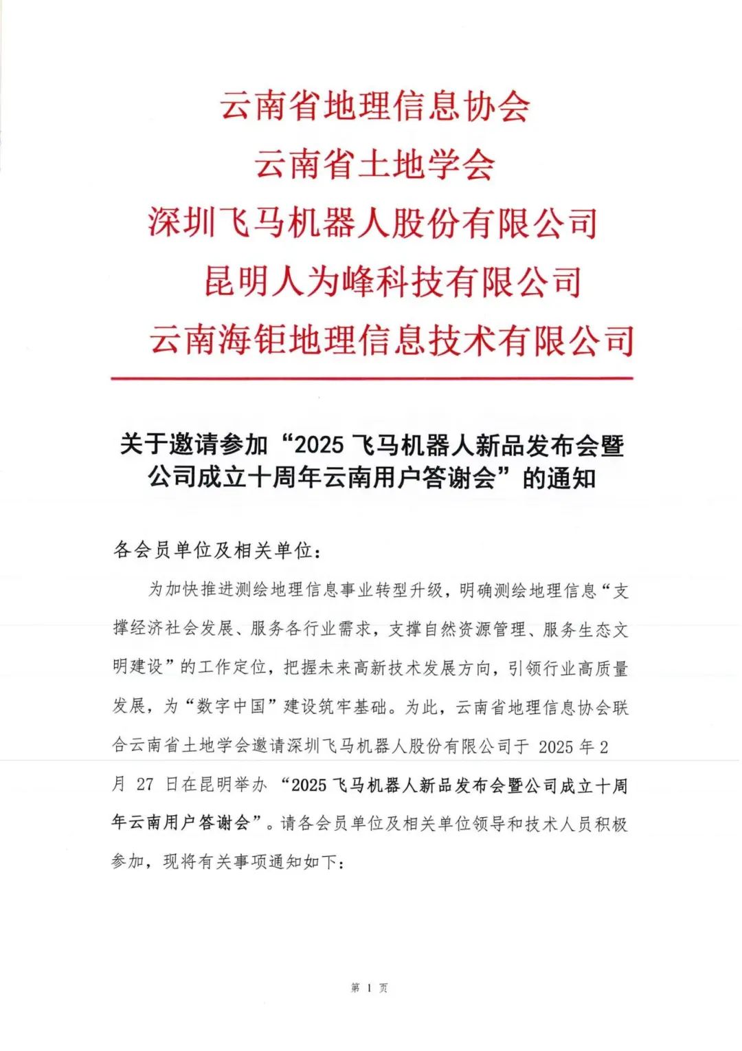 为加快推进测绘地理信息事业转型升级,明确测绘地理信息“支撑经济社会发展、服务各行业需求,支撑自然资源管理、服务生态文明建设”的工作定位,把握未来高新技术发展方向,引领行业高质量发展,为“数字中国”建设筑牢基础,云南省地理信息协会联合云南省土地学会、深圳飞马机器人股份有限公司、昆明人为峰科技有限公司、云南海钜地理信息技术有限公司于2025年2月27日在昆明举办“2025飞马机器人新品发布会暨公司成立十周年云南用户答谢会”。