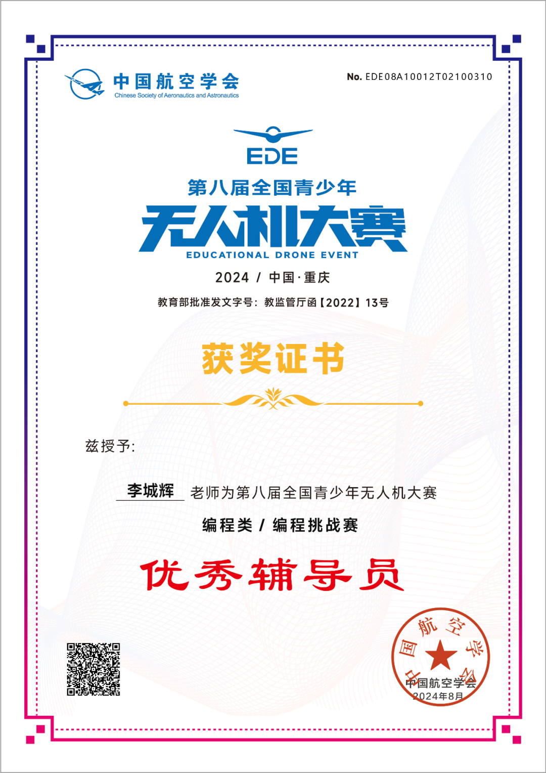 曾带领五名学生晋级《第七届全国青少年无人机大赛》荣获一等奖2名,二等奖3名。